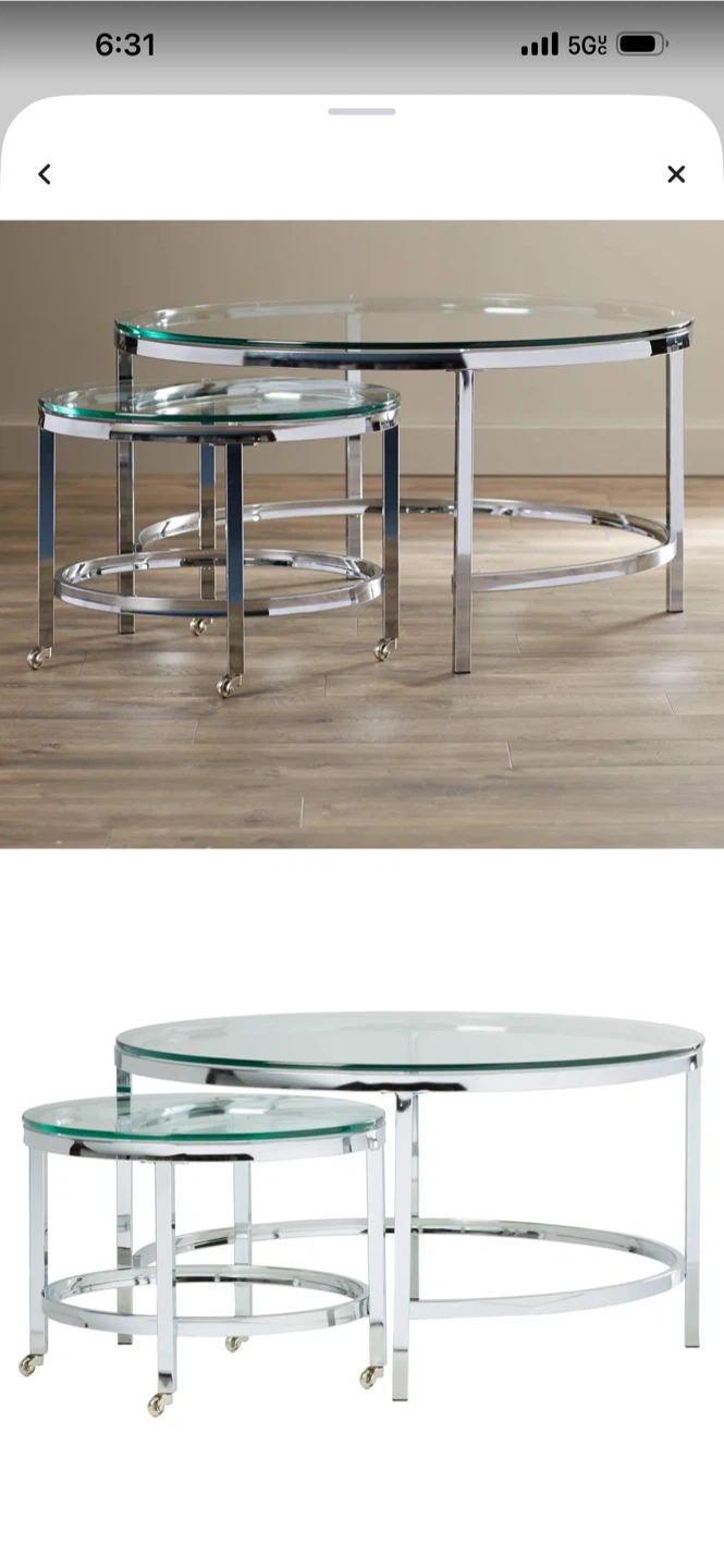 Selling a set of nesting coffee tables with a sleek, modern design. The tables feature a clear glass top and a chrome finish frame, adding a touch of elegance to any living space. The nesting design allows for easy storage and flexibility, making them perfect for smaller spaces or entertaining guests