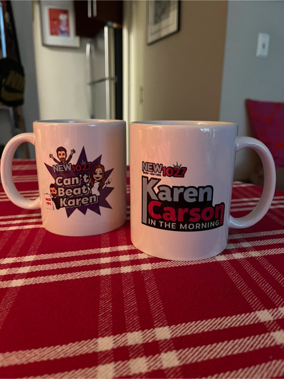 109Two mugs from radio station NEW 102.7. Front says "Can't Beat Karen", Back says "Karen Carson in the Morning".