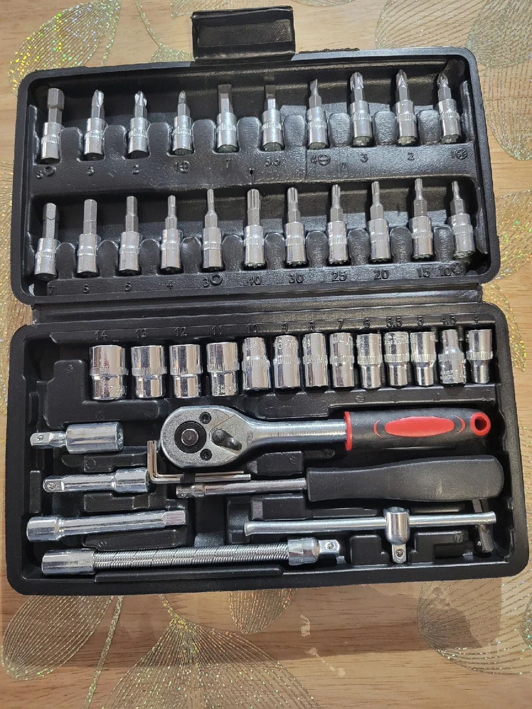Selling a 46-piece tool set, perfect for home and auto repairs! It includes various bits, sockets, and extensions. The set comes in a blow-molded case for easy storage and portability. Completely new, never used!