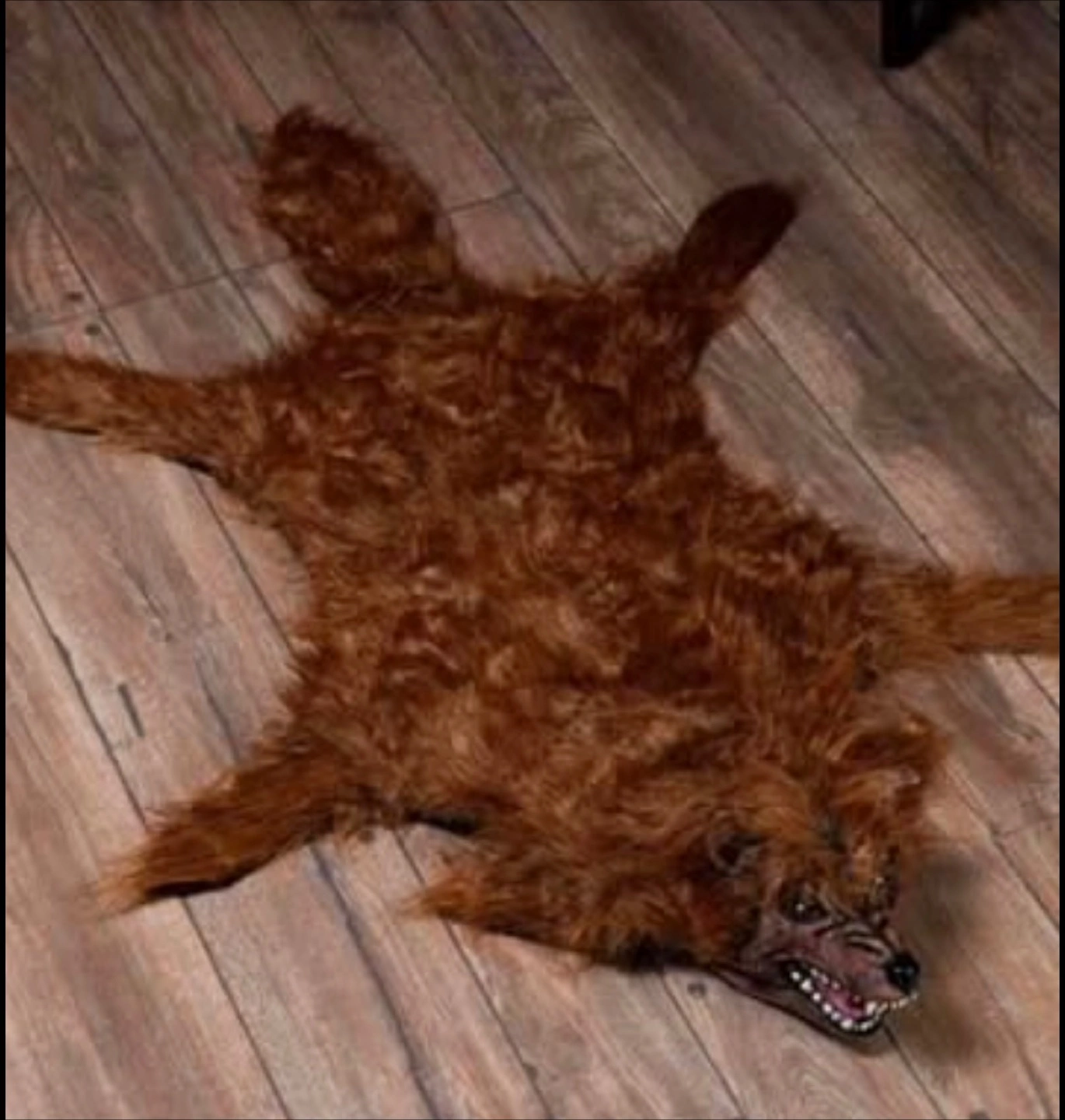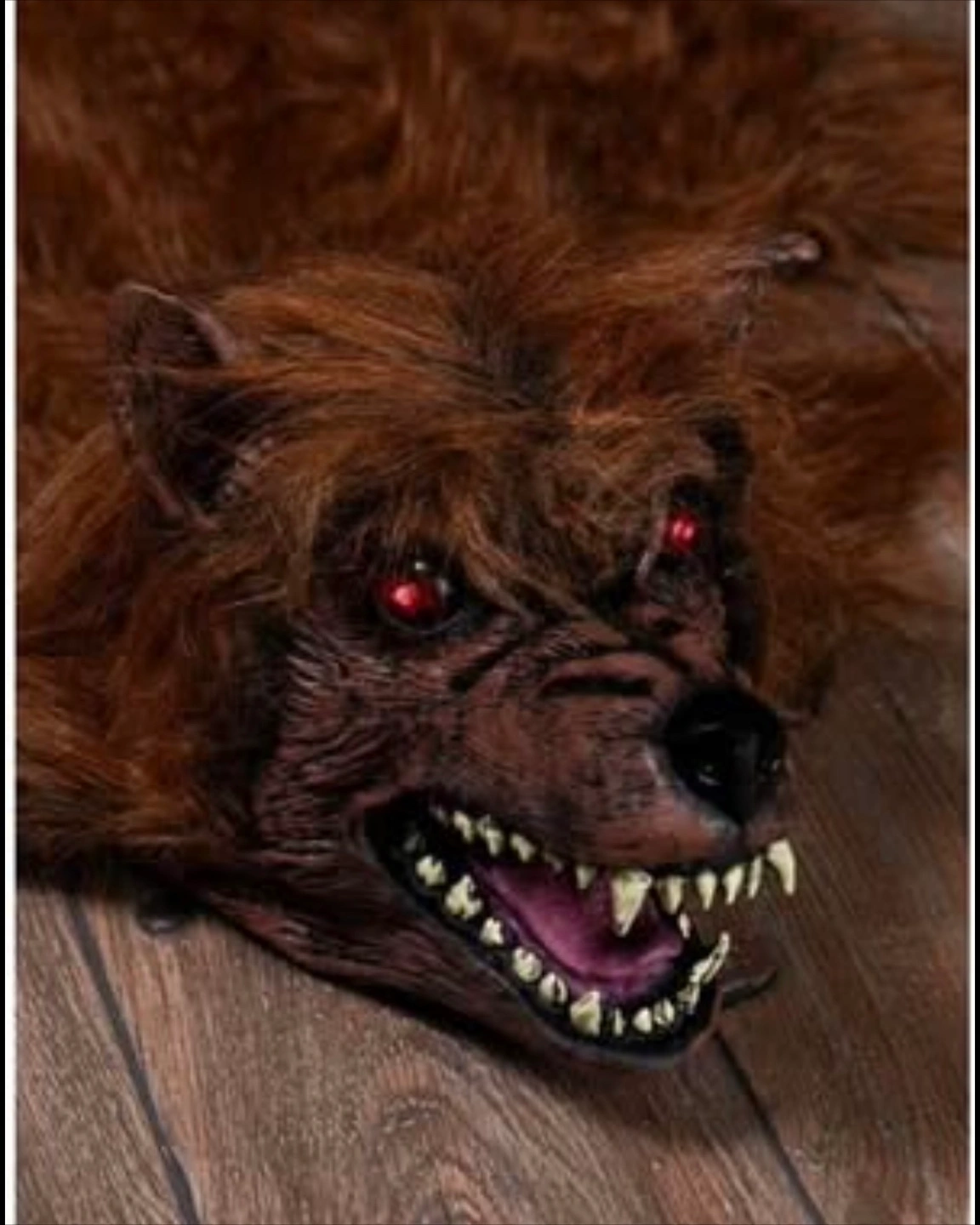 60Long pile faux fur "pelt," molded vinyl head Measures approx. 66"L x 32"W When activated by stepping on pressure sensors on the underside, eyes light up and rug makes howling sounds Battery pack fits into a pouch under the neck Requires 3 AA batteries (demo batteries included) Phillips-head screwdriver (not included) required to open battery compartment An Interesting Hunting Trip So you went on a monster hunt, rid the world of a predator with one well-placed silver bullet, and brought the pelt home to warn all other evil creatures to stay far away. Great! There's just one snag. The silver bullet isn't always entirely effective, and now your rug is trying to eat you. Product Details If you'd like a hilarious yet scary prop to shock your friends and family, this Werewolf Rug with Light and Sound Halloween Decoration is perfect for you! The faux fur rug is shaped like a wolf's pelt and has molded vinyl ears, eyes, and a sculpted, fang-lined snout. When activated by stepping on pressure sensors on the underside of the rug, its eyes light up and it emits a series of chilling howls. Perfect for your Halloween display ! Check out my other items Thanks for looking