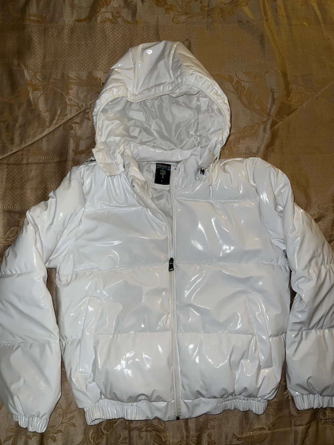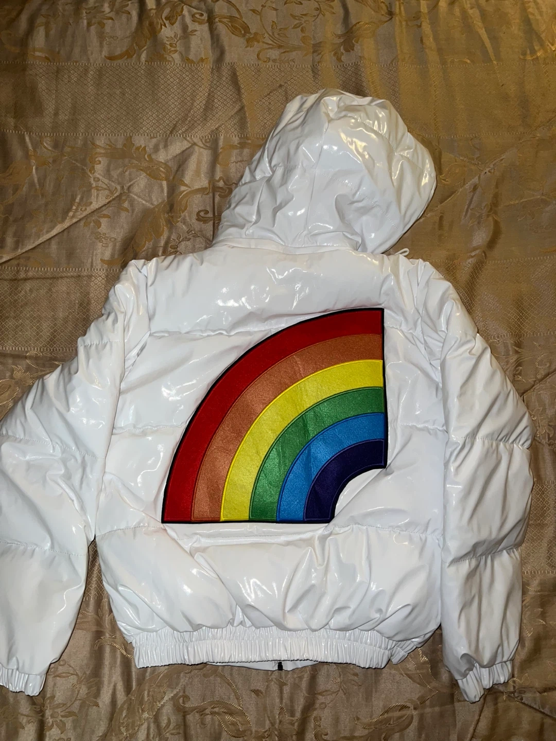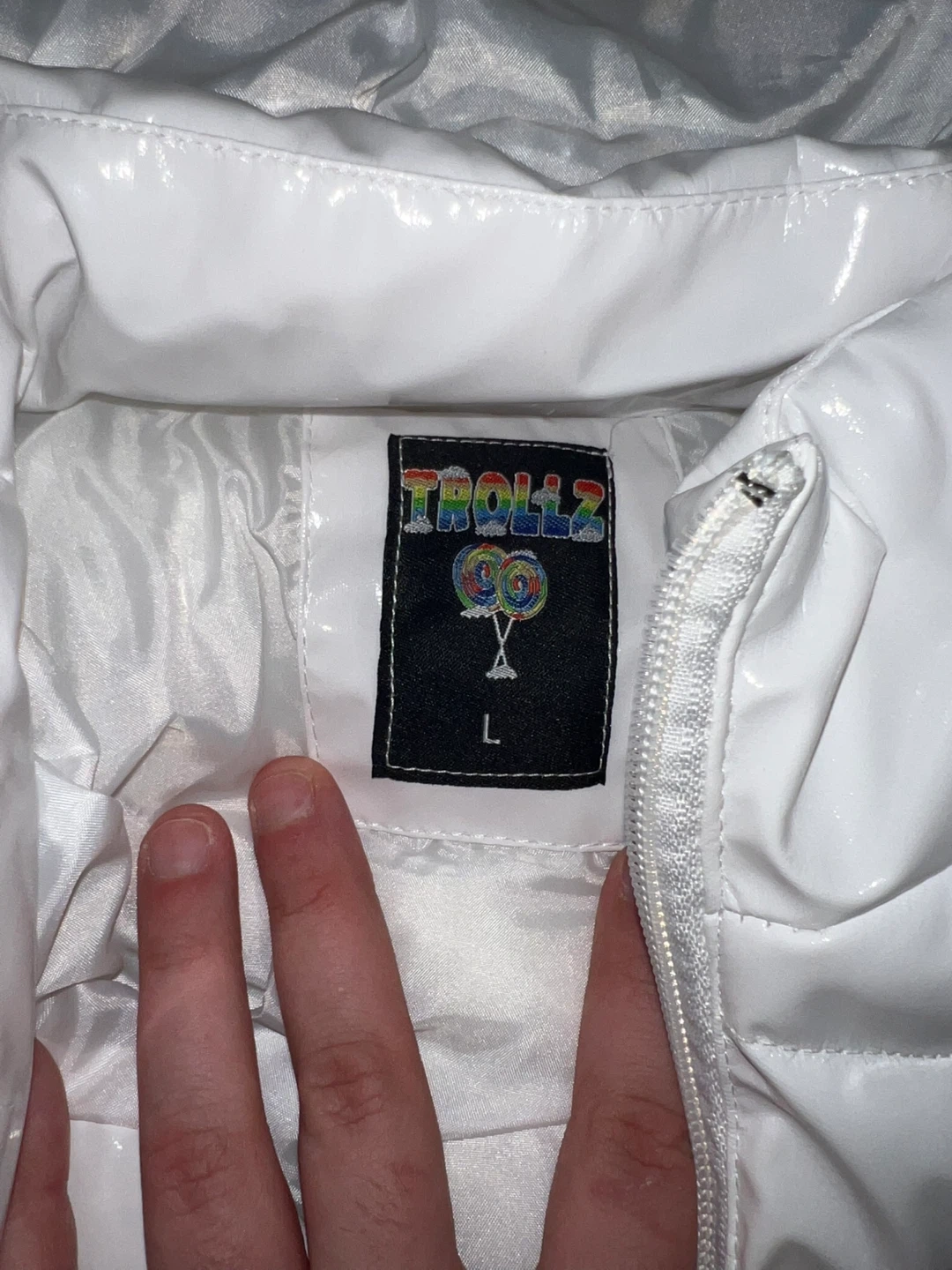 232New 6ix9ine TROLLZ merch. A white, size large, reflective feeling puffer jacket with an embroidered rainbow patch on the back. He wears one in the TROLLZ music video in a variety of colors Please message before buying