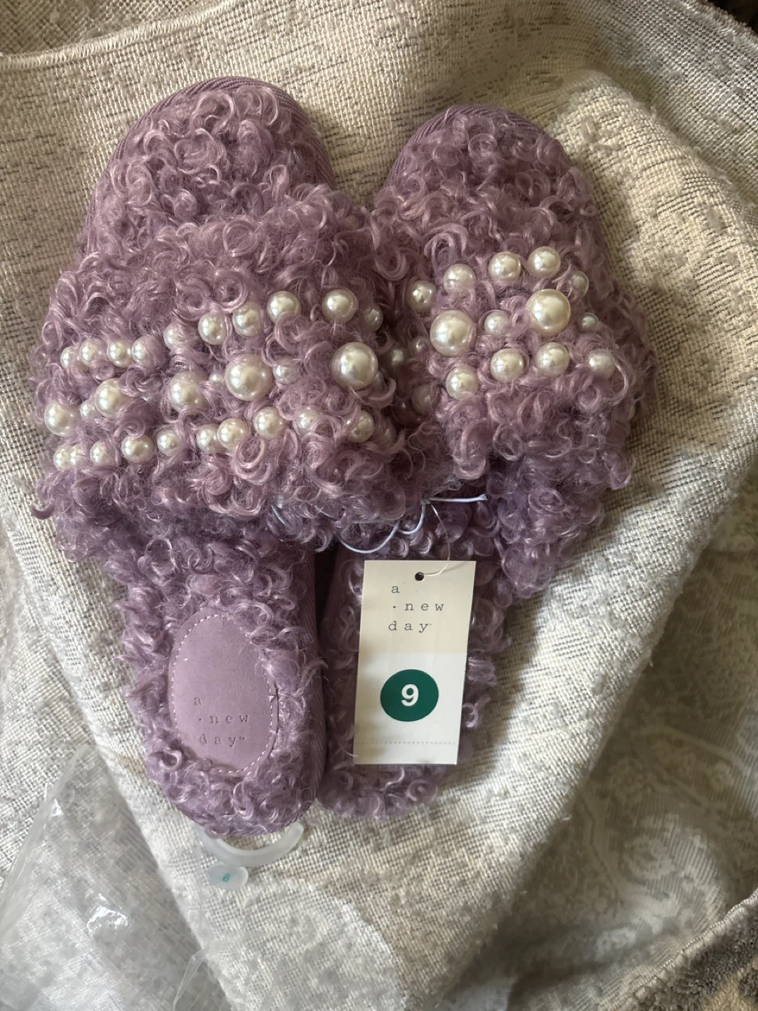 Brand new with tags! These A New Day slippers are a fuzzy purple color and feature faux pearl embellishments. They are a women's size 9. Have 6 pairs left in same size. Chanclas Moderna’s que pueden ser usadas como zapatos confortables. Me quedan 6 pares.