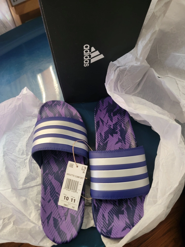 These Adidas Adilette Comfort slides are brand new and in their original box! They feature a stylish purple and silver design. Size US 10