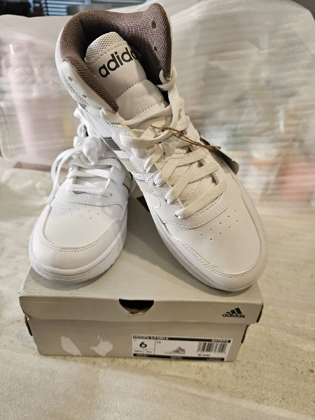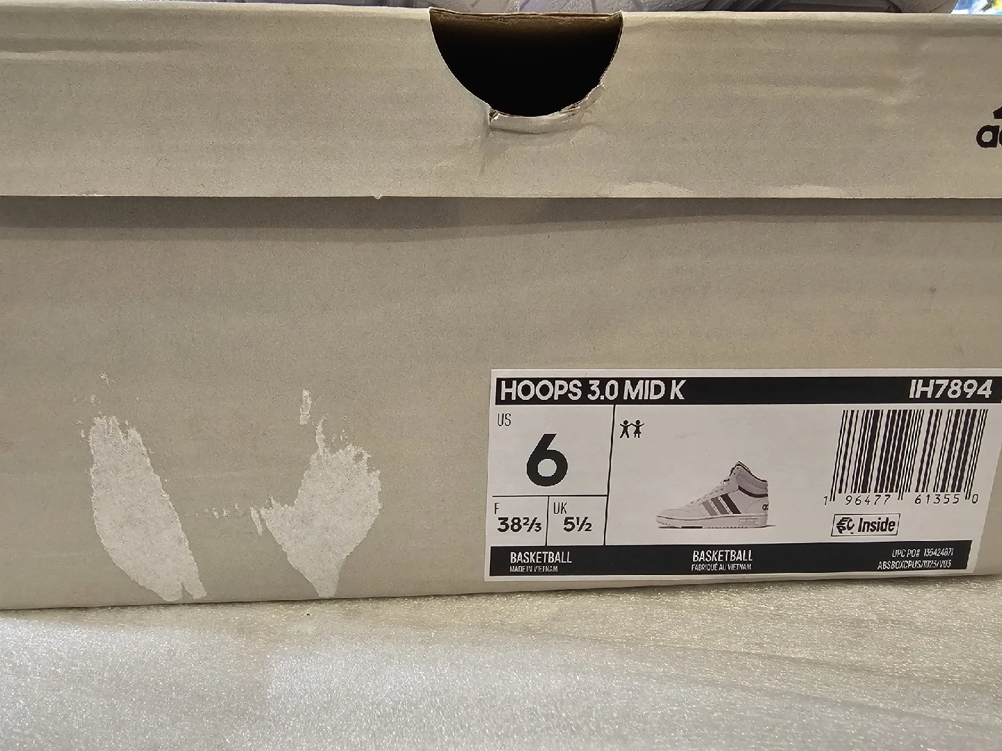 60Selling a pair of brand new Adidas Hoops 3.0 Mid K sneakers in white! These are youth size US 6 or 7W. They come in the original box.