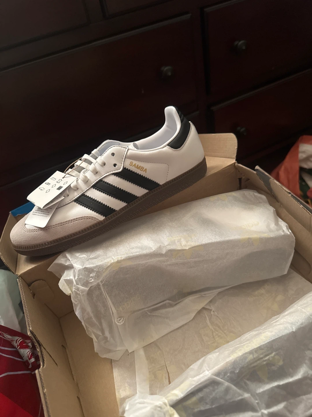 70I'm selling a brand new pair of Adidas Samba OG J sneakers in white and black! They are a size 7 US. The box is included.