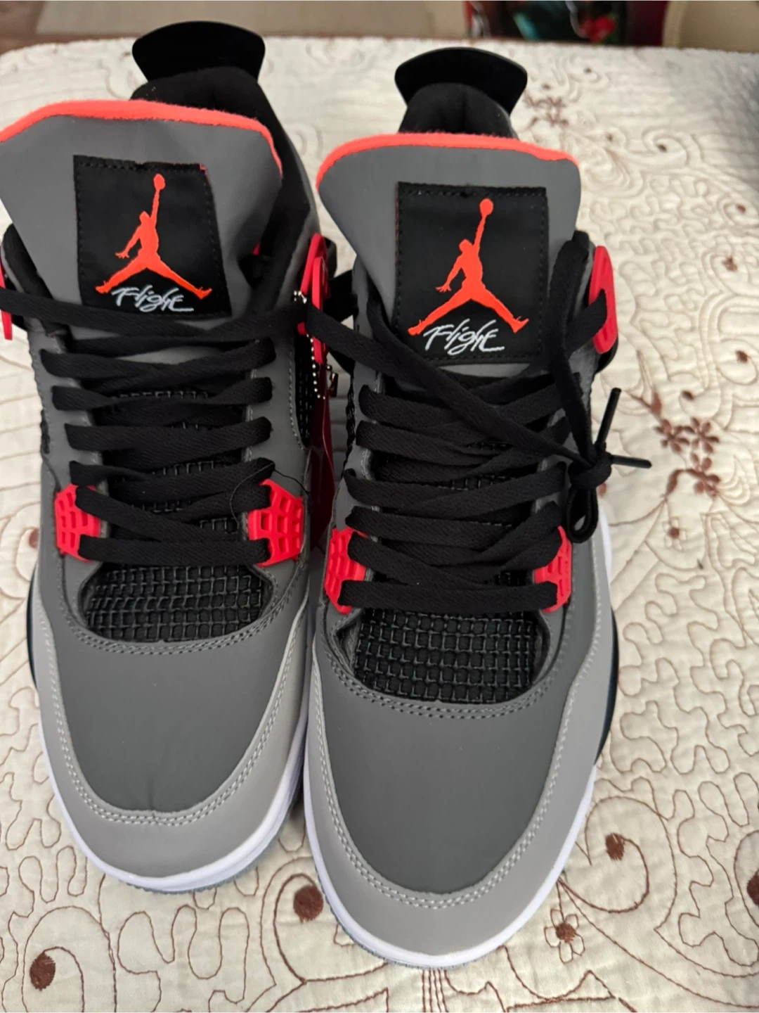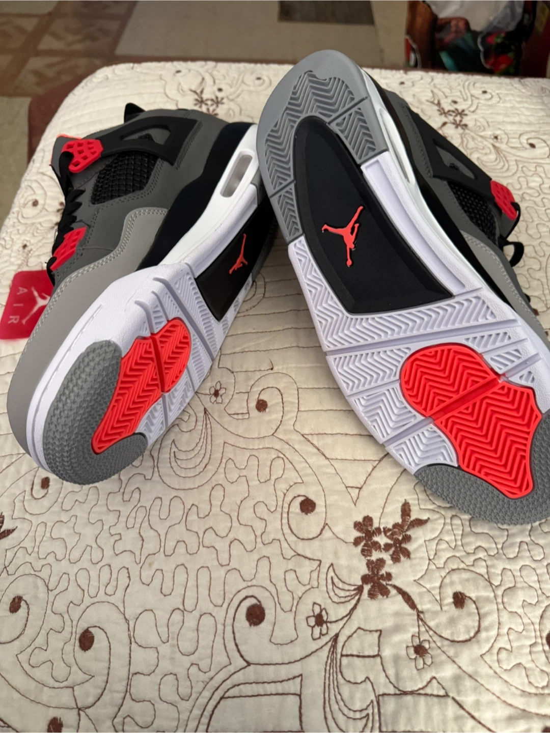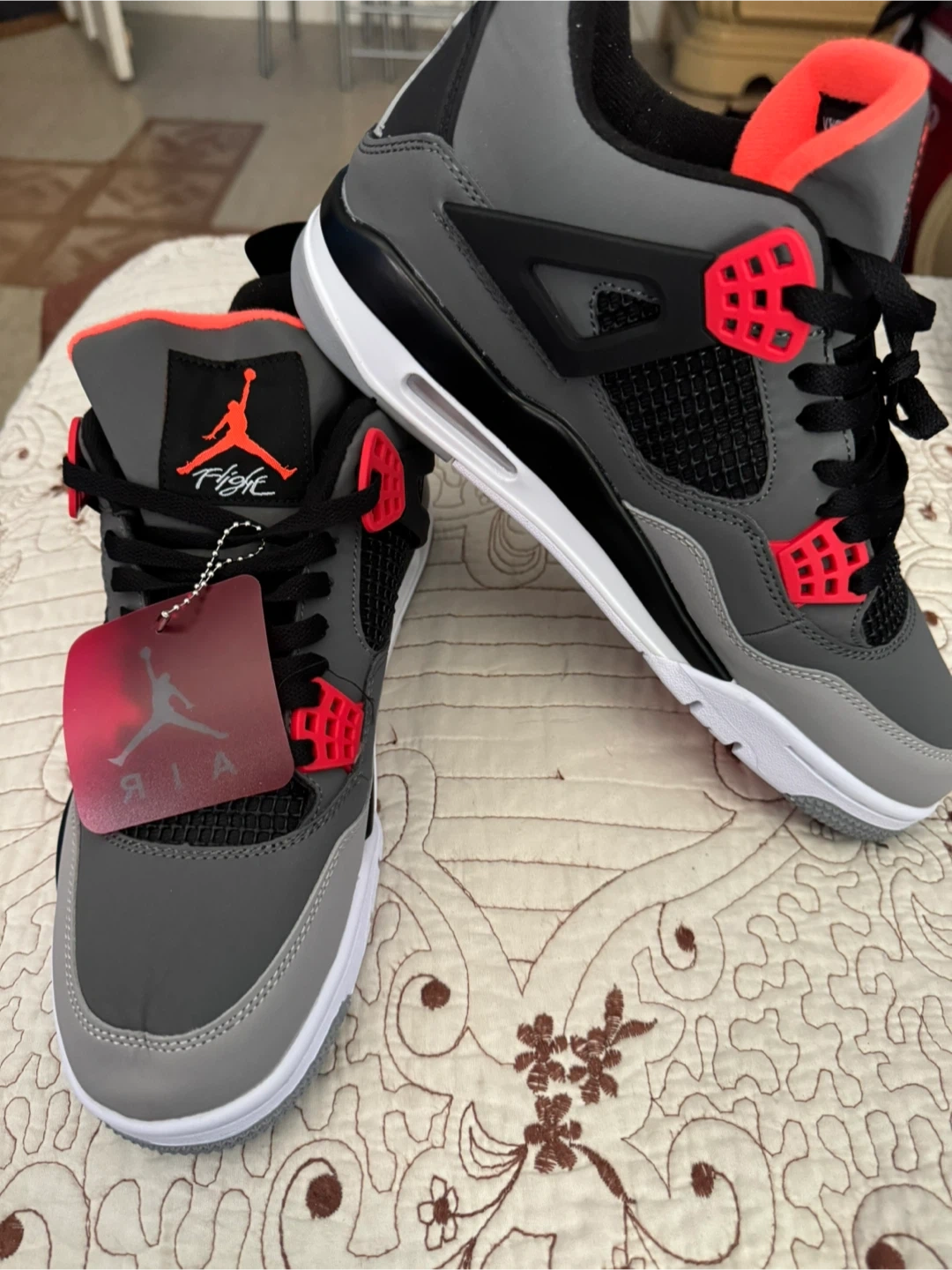 10Selling a pair of brand new Air Jordan 4 Retro Stealth sneakers in US size 10! They have a cool gray, black, and red color scheme. Never worn, so they're in perfect condition!