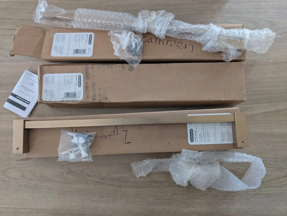 15Achieve a cohesive, designer look in your bathrooms with this brand-new set of three Amerock Monument towel bars. The stunning Champagne Bronze finish and clean, modern lines provide a sophisticated update that will instantly elevate your space. These three 18-inch towel bars are new, unused extras from a recent home project and are still in their original boxes. This is a perfect opportunity to get a complete, matching set for multiple bathrooms at a price you won't find in stores. All original mounting hardware is included. KEY DETAILS ➡️ Quantity: 3 Towel Bars ➡️ Brand: Amerock ➡️ Collection: Monument ➡️ Finish: Champagne Bronze ➡️ Size: 18 in. (46 cm) ➡️ Condition: New in Box (Unused) PRICING ✅ $40 for the entire set of 3 (A fantastic deal!) Pickup in Orange Lake. Comes from a smoke-free home.
