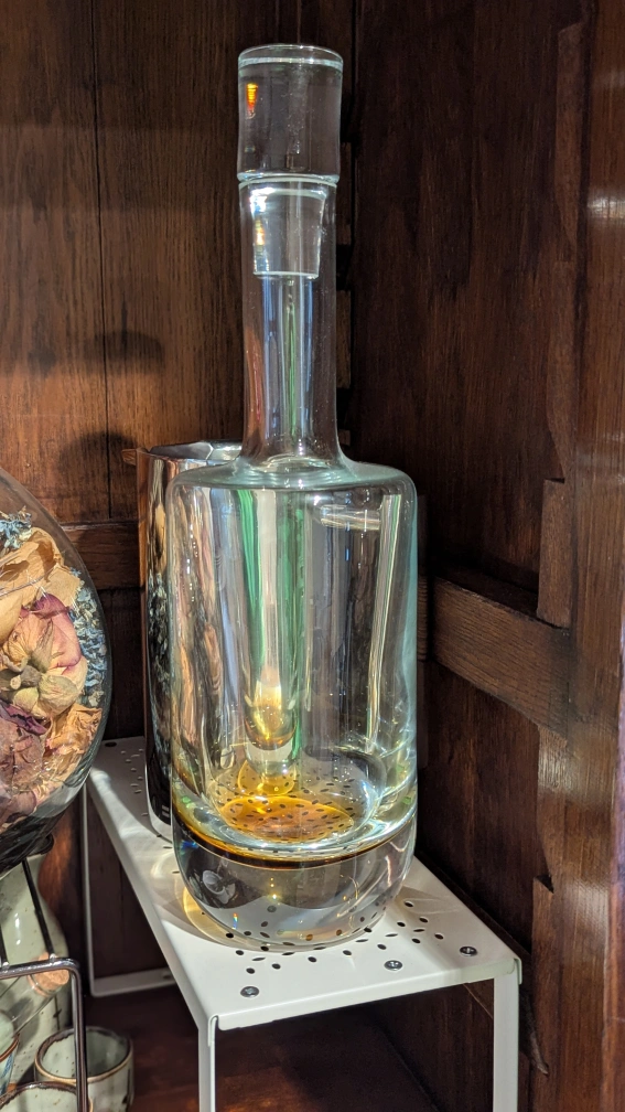 Clear glass carafe, with a narrow neck. A matching glass stopper seals the top. This carafe could be used as a beautiful way to serve water to guests.