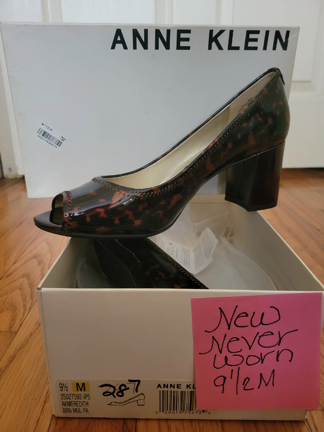 These are brand new Anne Klein AKMeredith heels, never worn! They are a size 9.5M and come in the original box. The color is BRN MUL PA (Brown Multi Patent).