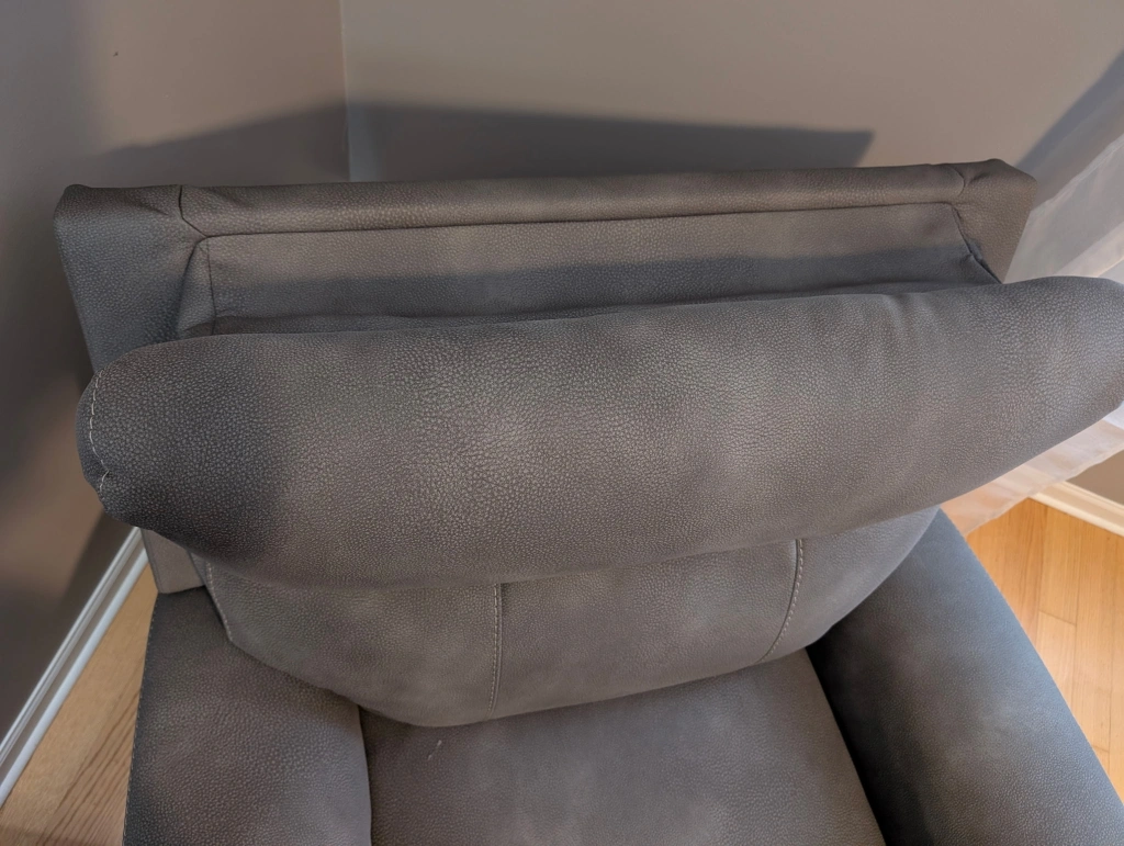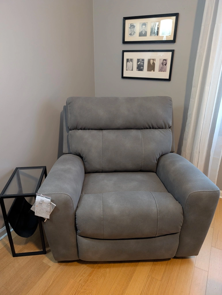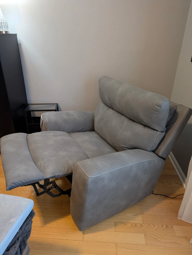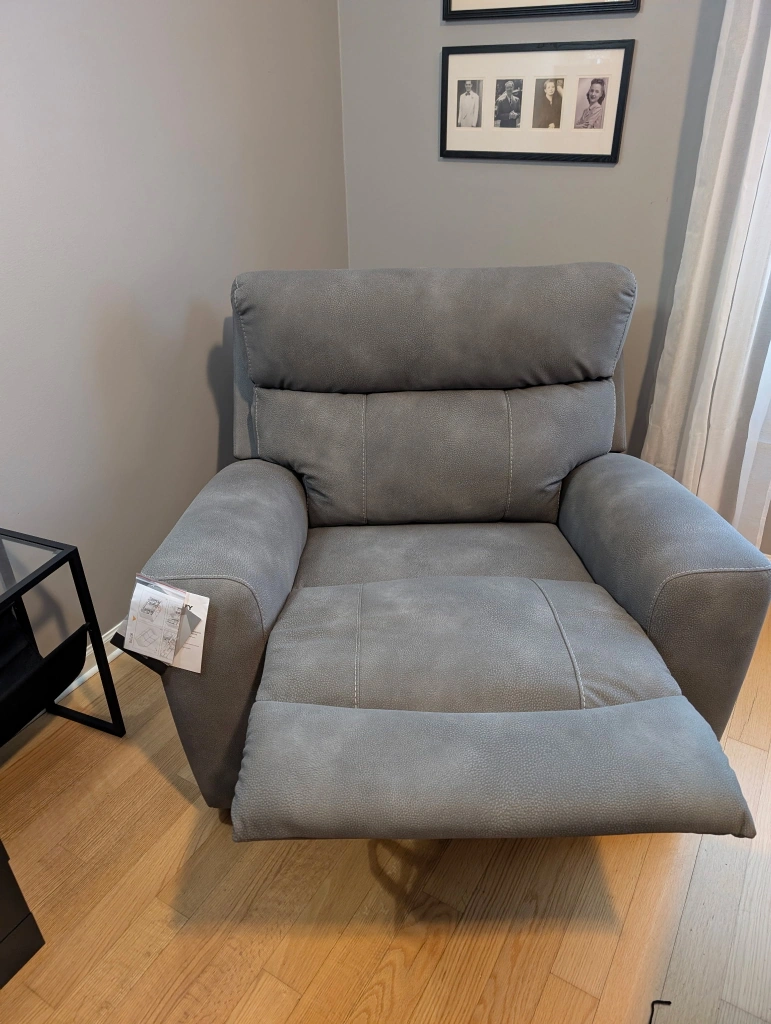90Signature Design Ashley Recliner Power recline and headrest. Roomy 25 inch wide seat. Gray fabric Faux Vegan Leather. Very Comfortable. Just purchased but circumstances changed and we could not return after 48 hours. Tags are still on the chair.We paid $850 on sale. Original price was $1000. Asking $600. cash only please.. Must pick up in Elgin. no delivery