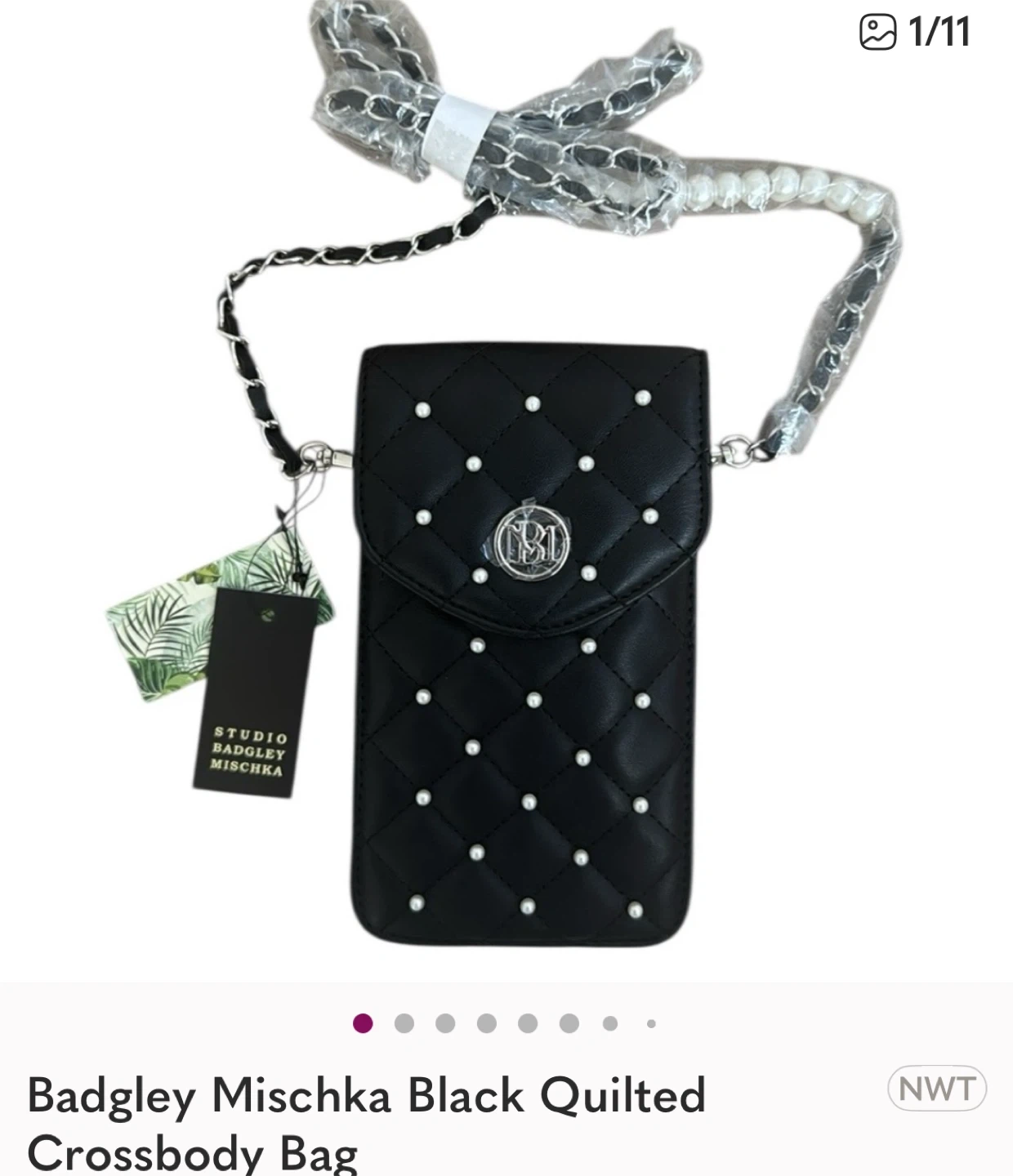 This is a brand new Badgley Mischka black quilted crossbody bag! It's perfect for carrying your phone and other small essentials. The bag features a stylish quilted design with pearl accents and a chain strap. Never been used!