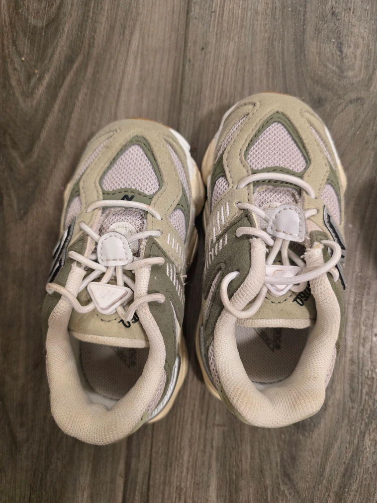 10Selling a pair of New Balance 090 toddler sneakers. They have a light green and white color scheme and feature a comfortable design for little feet. Great for everyday wear! size 5c