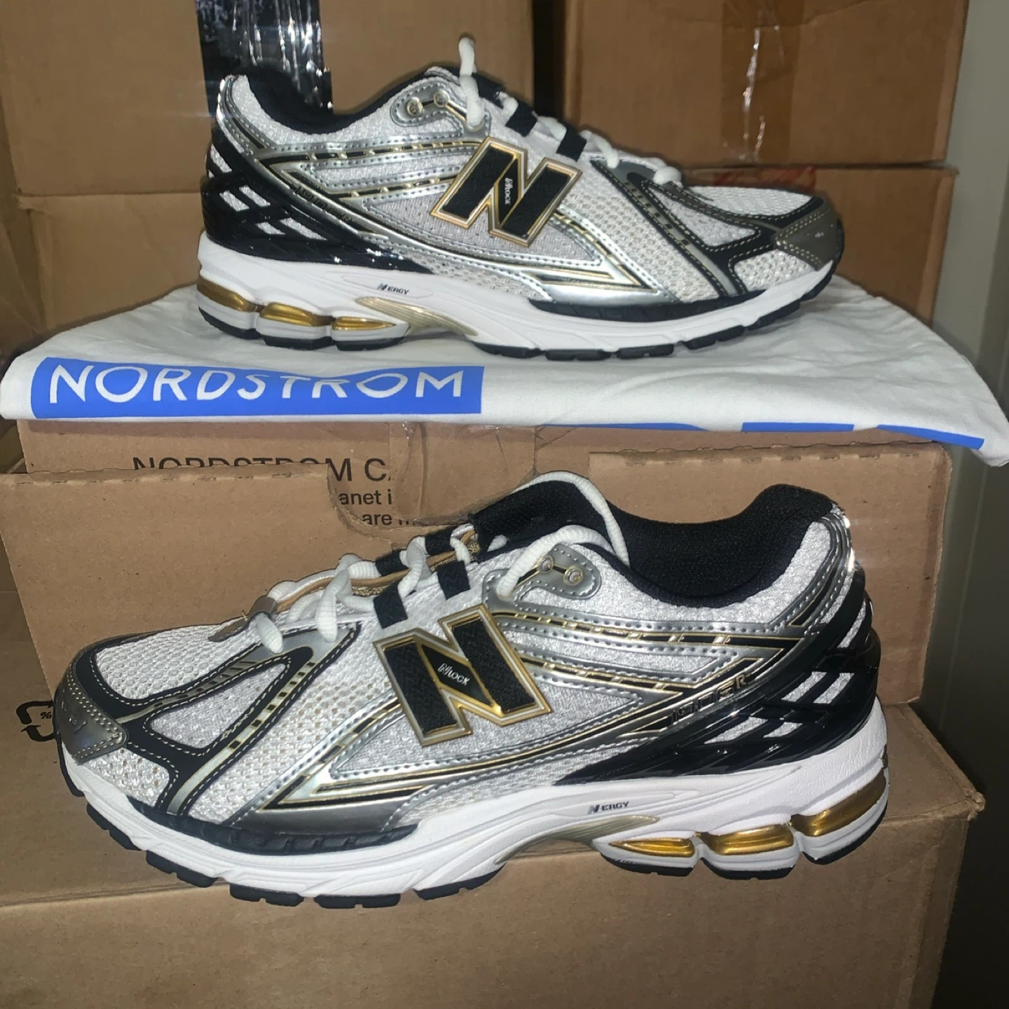 142Selling a pair of New Balance 1906R sneakers in a stylish white and gold colorway. They are a US size 7. These sneakers feature enhanced performance with Ortholite insoles and a neutral cushion for ultimate comfort. The manufacturing date is 2023 July 20