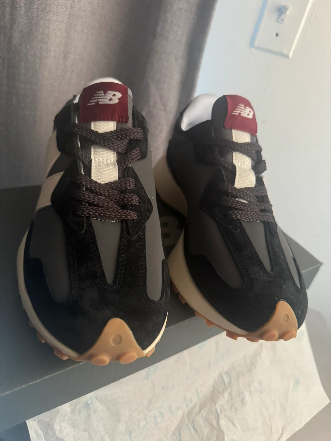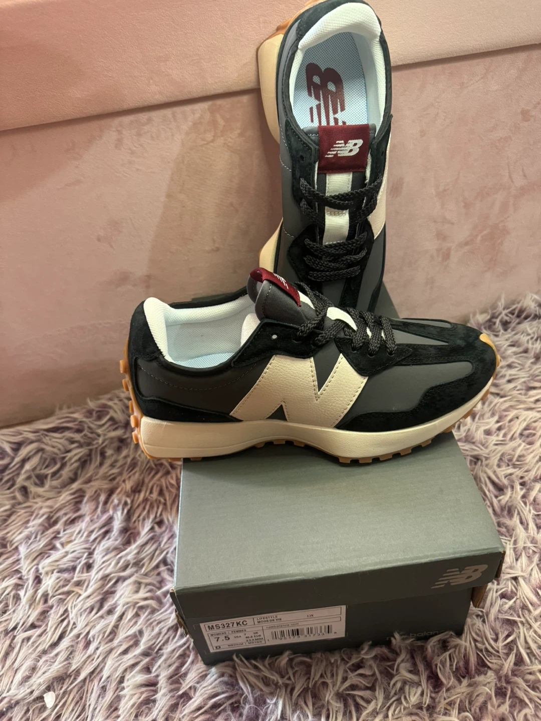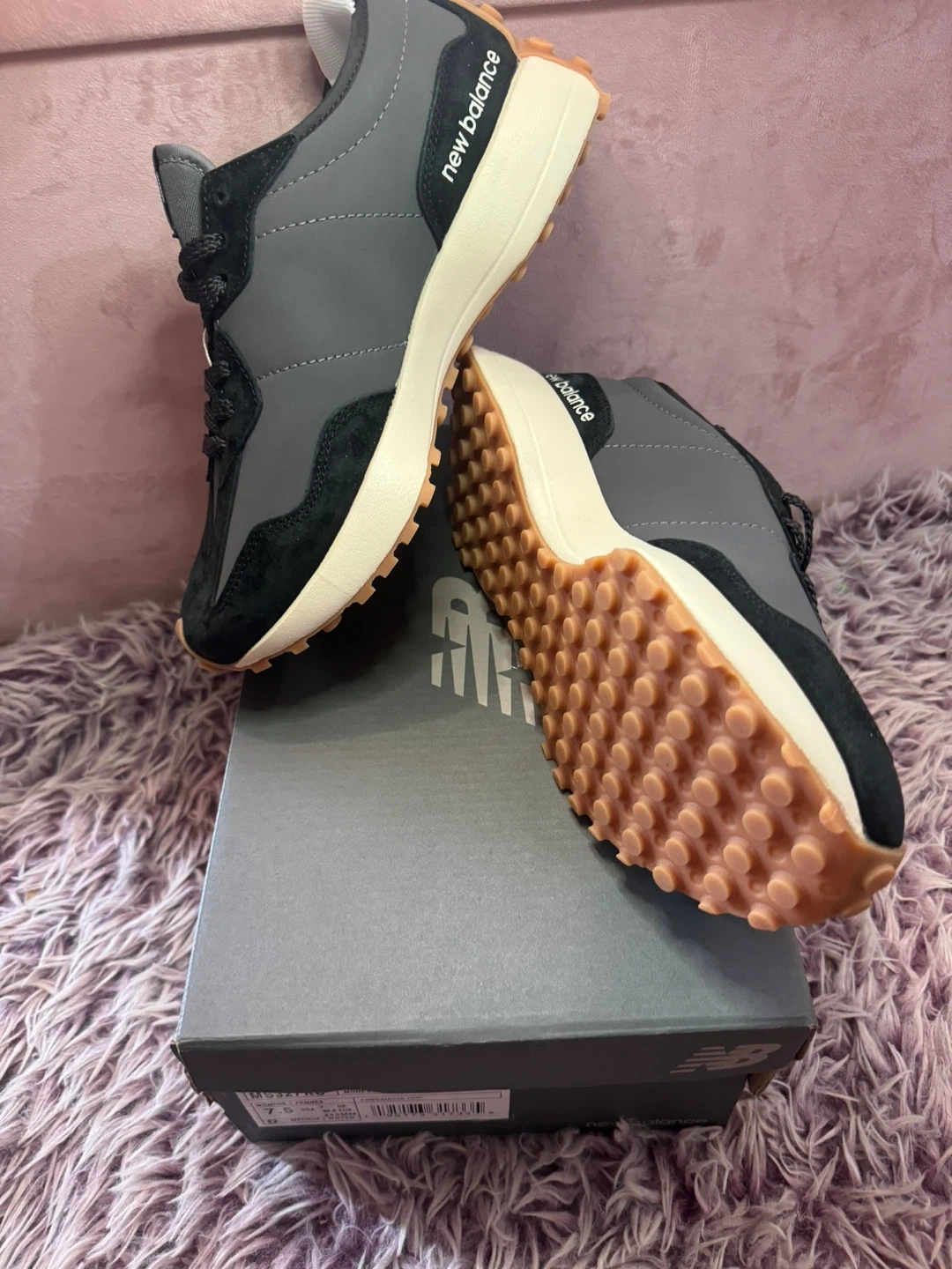 Selling a pair of New Balance 327 sneakers in gray and black! They are size 7.5 and come with the original box
