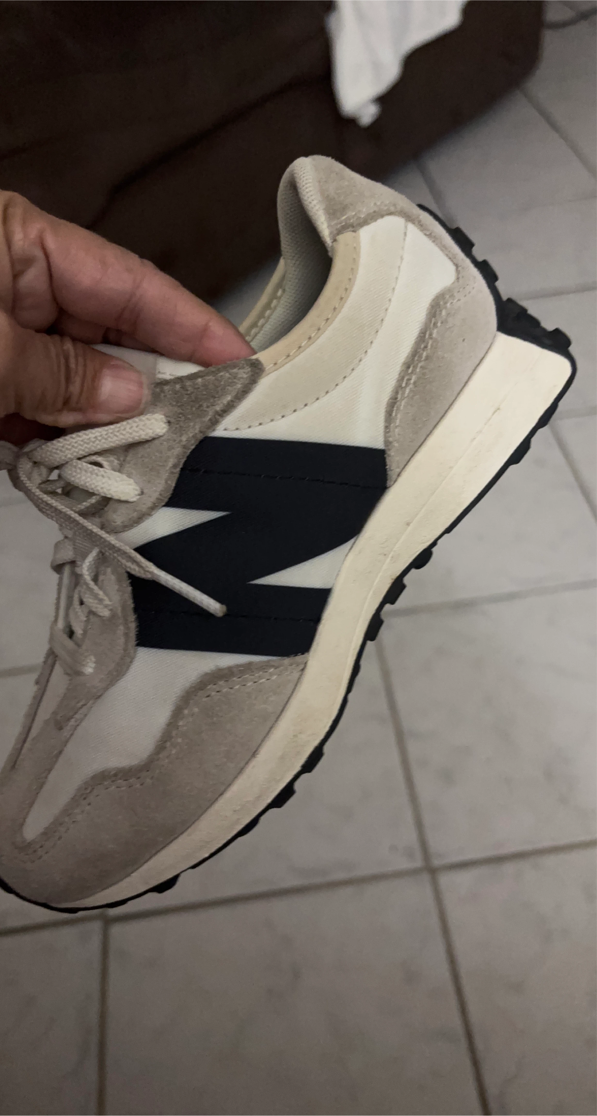 10Selling a pair of New Balance 327 sneakers! They feature a stylish design with a blend of white and gray suede accents, complemented by a black "N" logo. These sneakers are perfect for a casual, everyday look
