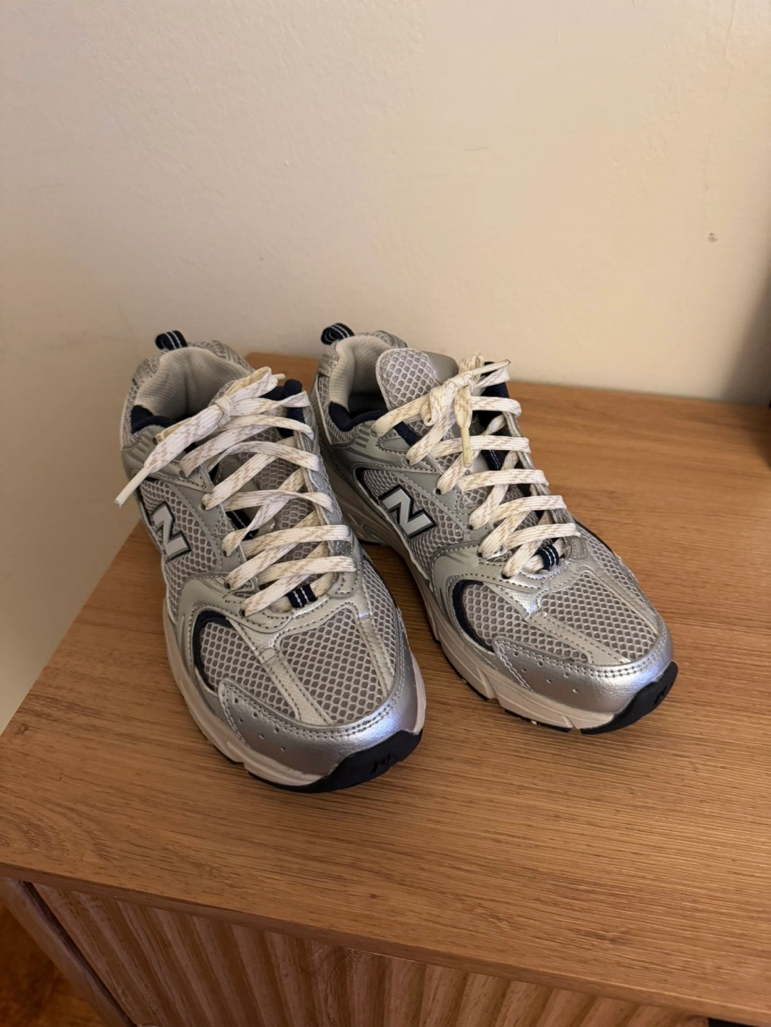 Silver gray New Balance 530 sneakers. Mesh and leather upper. Cream laces. Minimal wear.