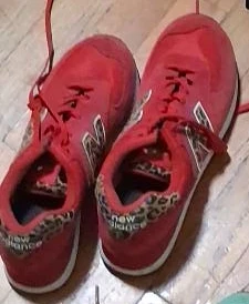 26Selling a pair of New Balance 574 sneakers in a vibrant red color with a fun leopard print accent! They're in really good condition, minor wear & ready for a new home. These are a stylish and comfortable choice for everyday.