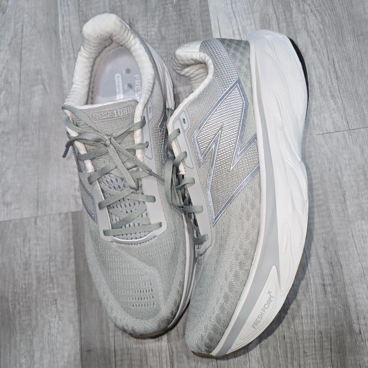 10Selling a pair of New Balance Fresh Foam 1080 running shoes. They are a light gray color and feature Fresh Foam technology for a comfortable run