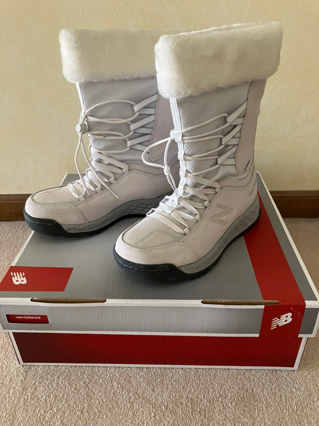 10These New Balance Fresh Foam snow boots are in great condition and come with the original box! They are a light grey color with a faux fur trim. Perfect for keeping your feet warm and dry this winter!