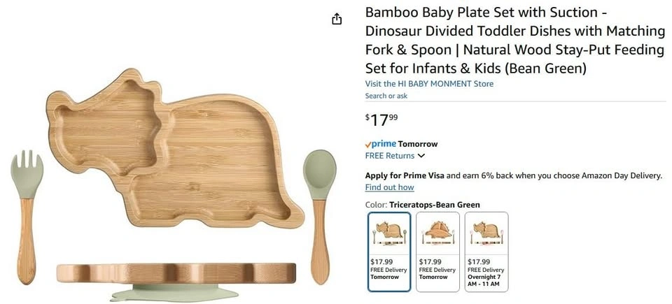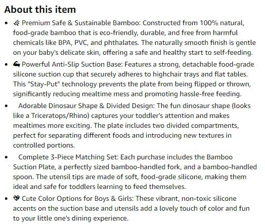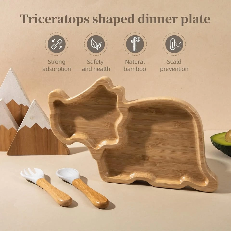 New~Bamboo Stay-Put Feeding Set for Infants & Kids, Triceratops