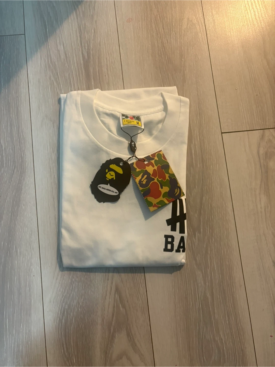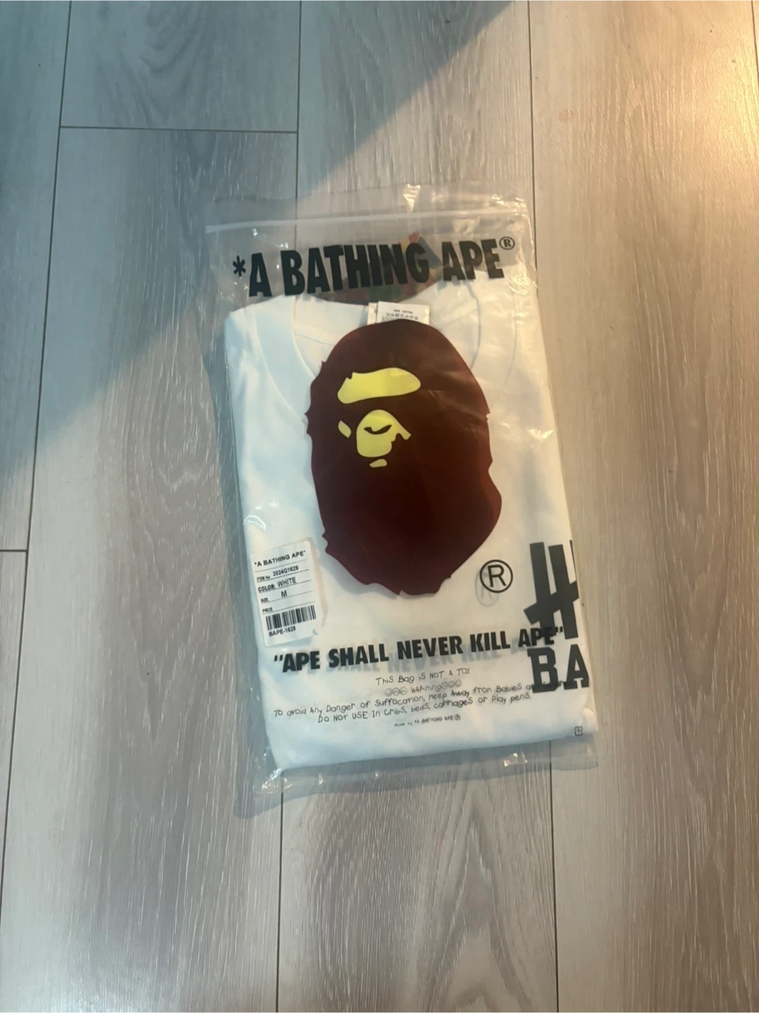 This is a brand new BAPE x Undefeated "Return of the BAPE" T-shirt. It's a size medium and comes in white. Features the classic BAPE logo and Undefeated branding. The shirt is still in its original packaging!