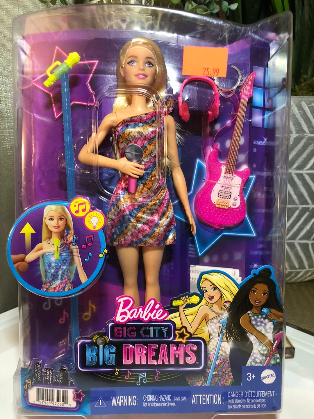 37This Barbie Big City Big Dreams doll is brand new in its original packaging! It includes a doll, microphone, guitar, and headphones. It is recommended for ages 3+