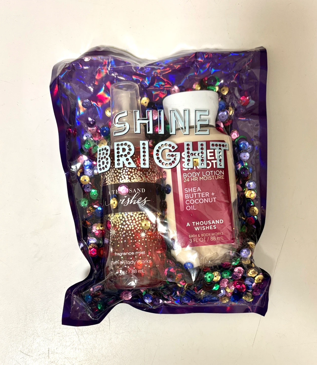 I'm selling a brand new Bath & Body Works Shine Bright gift set! It includes a body lotion and a fragrance mist. Both in the sent 1000 wishes!! Perfect for gifting or treating yourself!