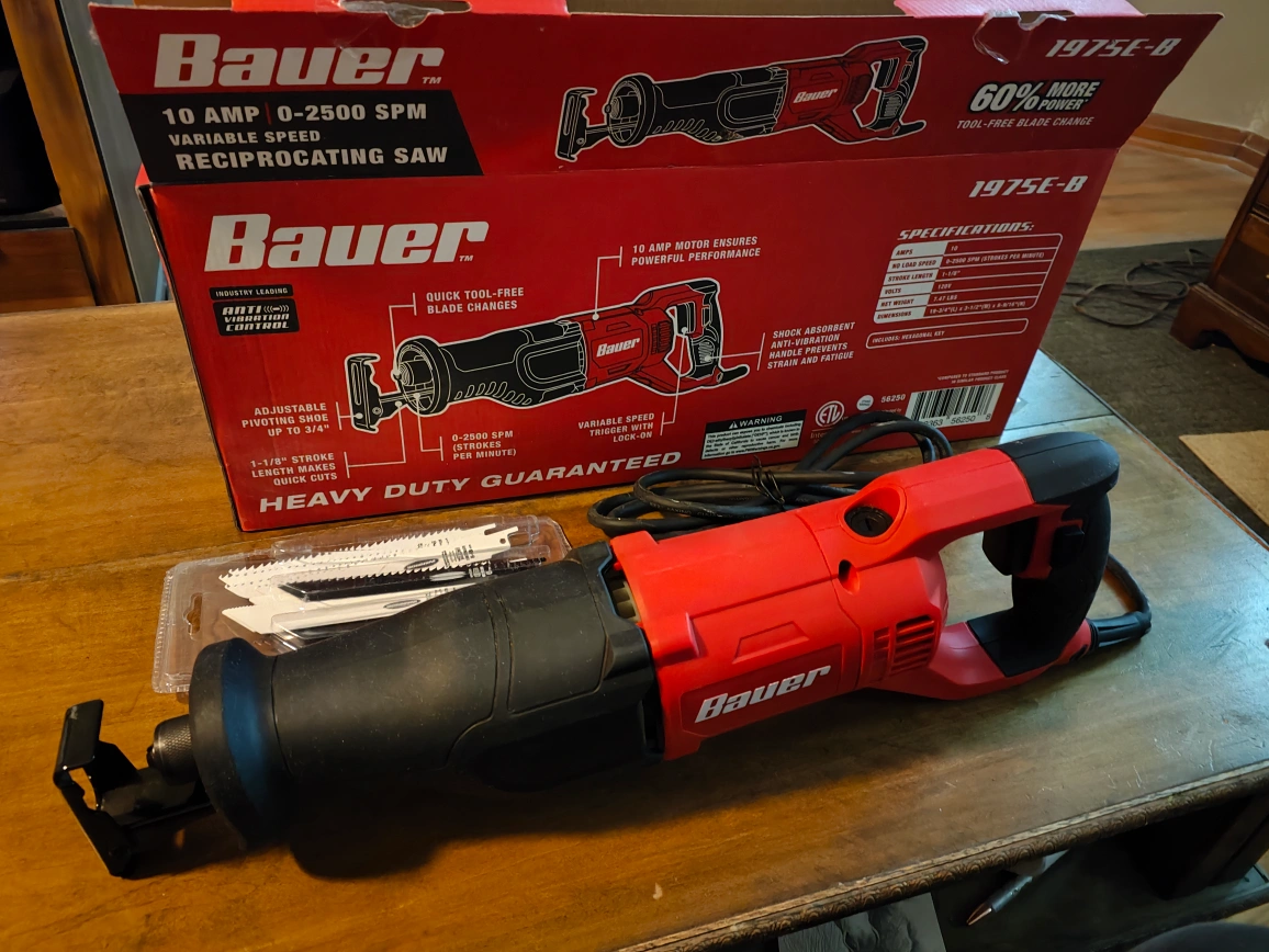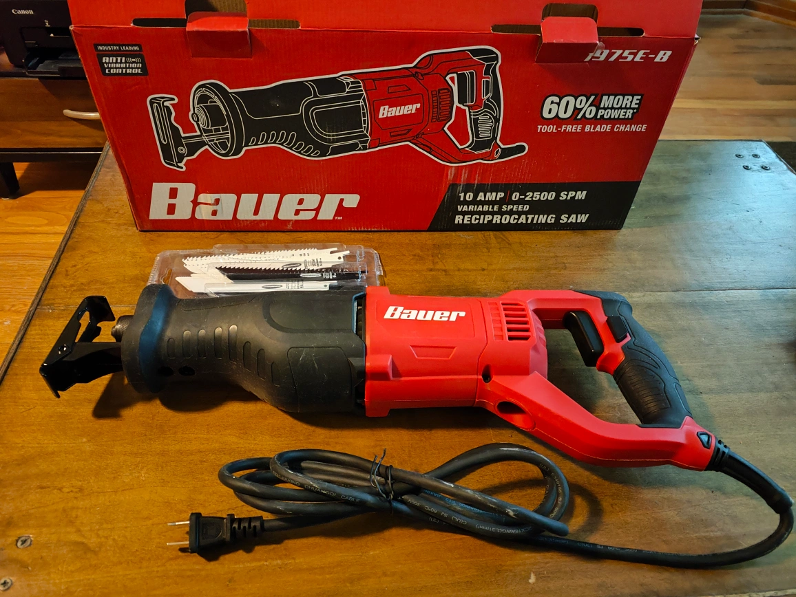 Selling a Bauer 1975E-B reciprocating saw in new condition! This heavy-duty saw features a 10 AMP motor and variable speed from 0-2500 SPM, making it perfect for quick cuts. It also has a tool-free blade change system. Comes with the original box and blades!