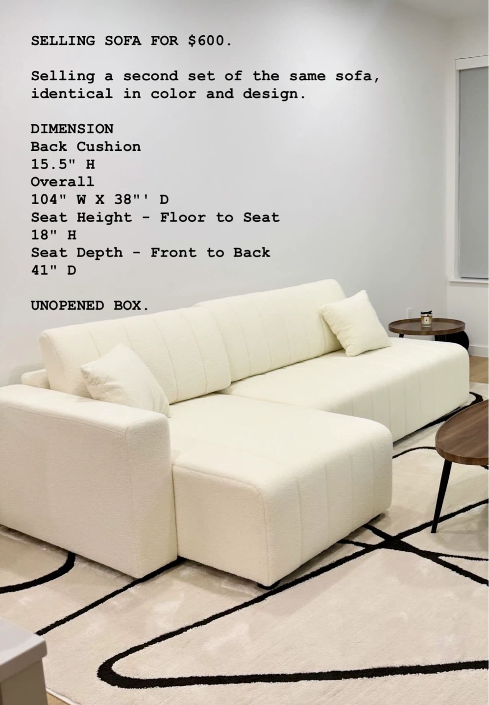 Selling a second set of the same sofa, identical in color and design Dimensions: - Back Cushion: 15.5" H - Overall: 104" W x 38" D - Seat Height (Floor to Seat): 18" H - Seat Depth (Front to Back): 41" D Unopened box.