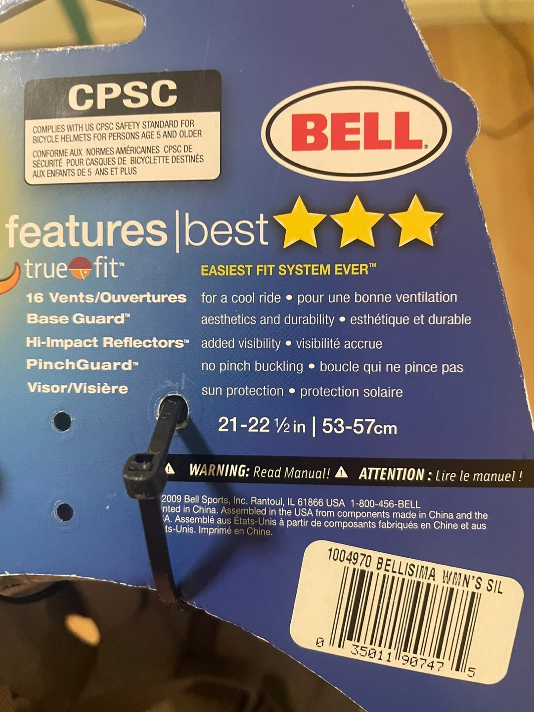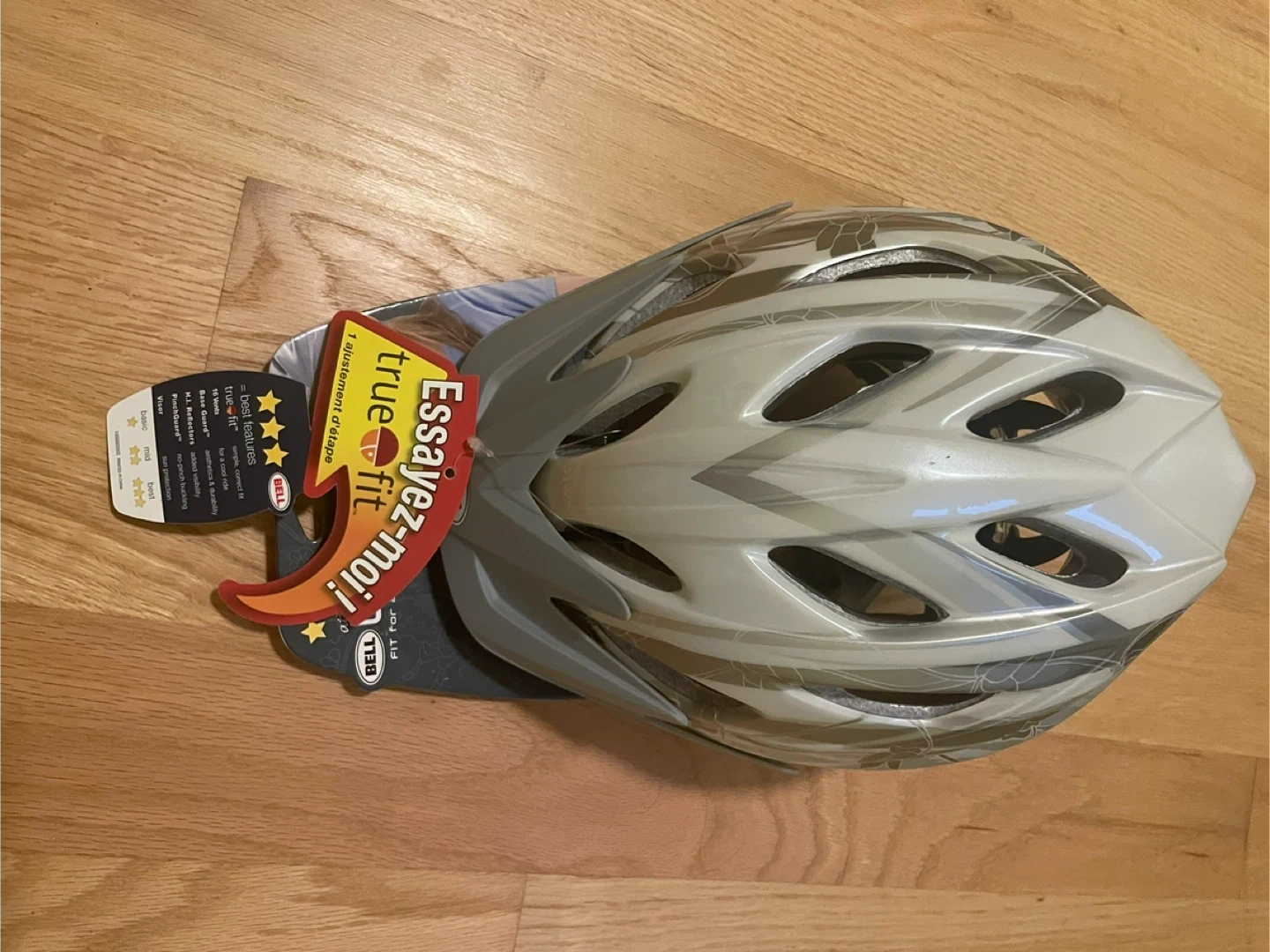 Selling a brand new Bell Bellisima women's bike helmet in gray! It fits sizes 53-57cm and weighs only 262 grams. It features 16 vents for a cool ride and hi-impact reflectors for added visibility. The easiest fit system ever and sun protection are great selling points!