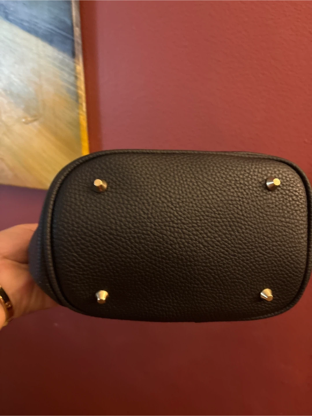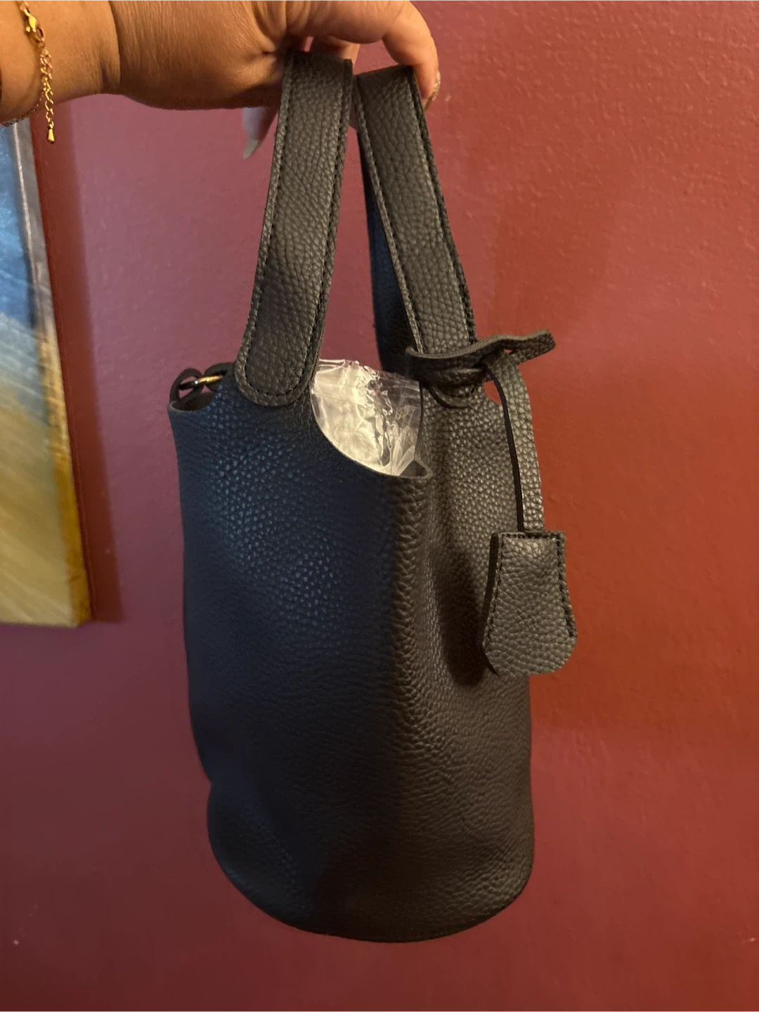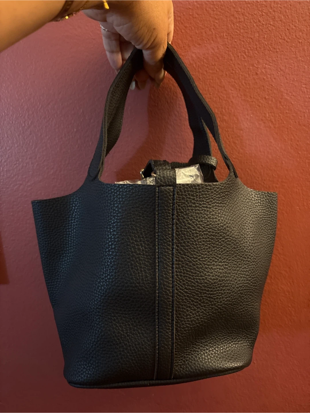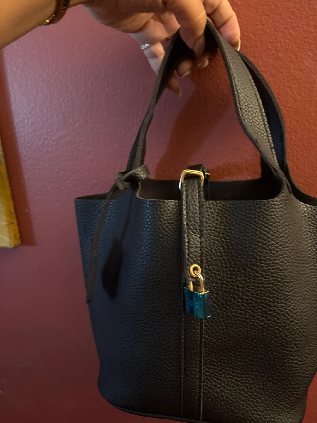1000+This is a cute black handbag made of pebbled vegan leather. It's in great condition and ready for a new home! It features a unique lock and a stylish design, perfect for everyday use comes with pouch New