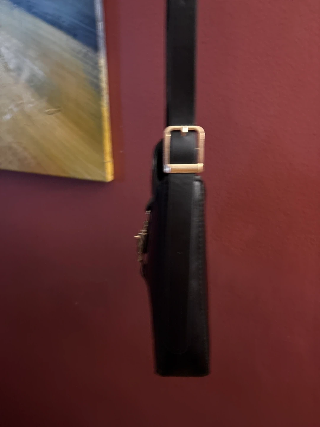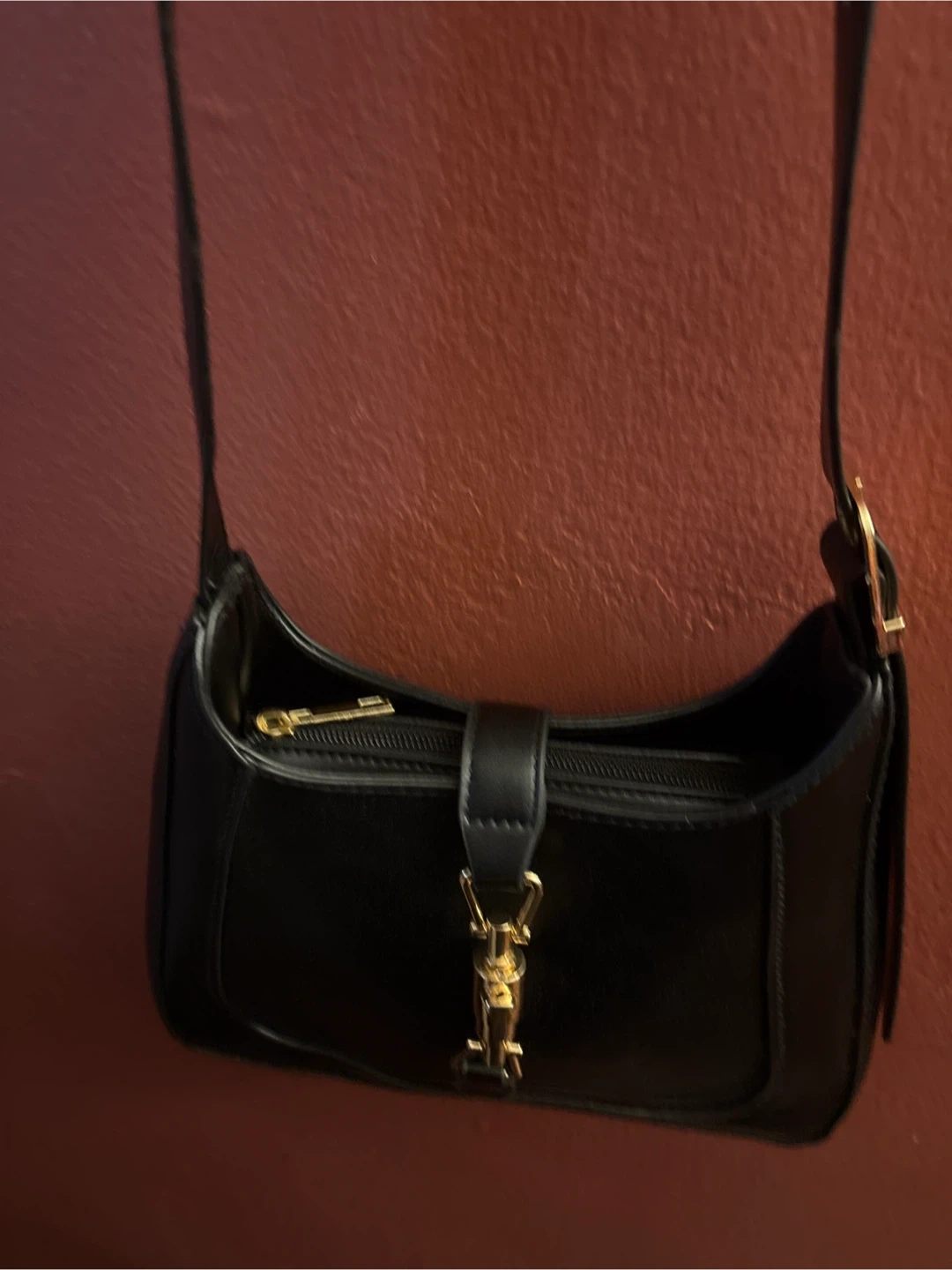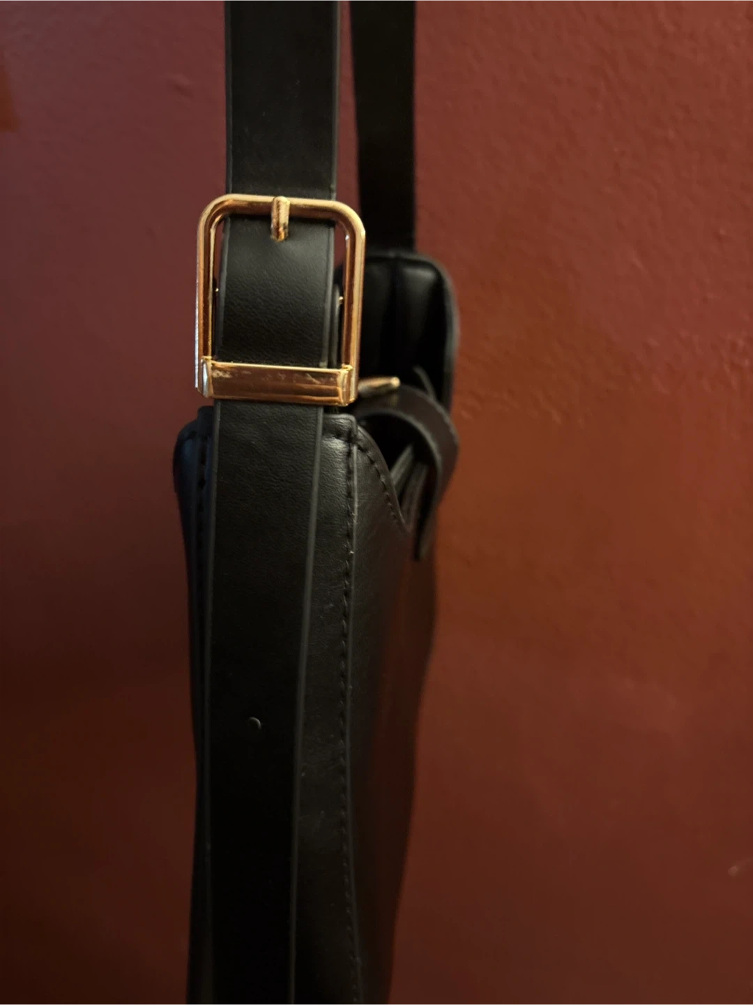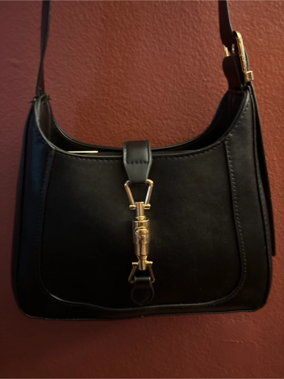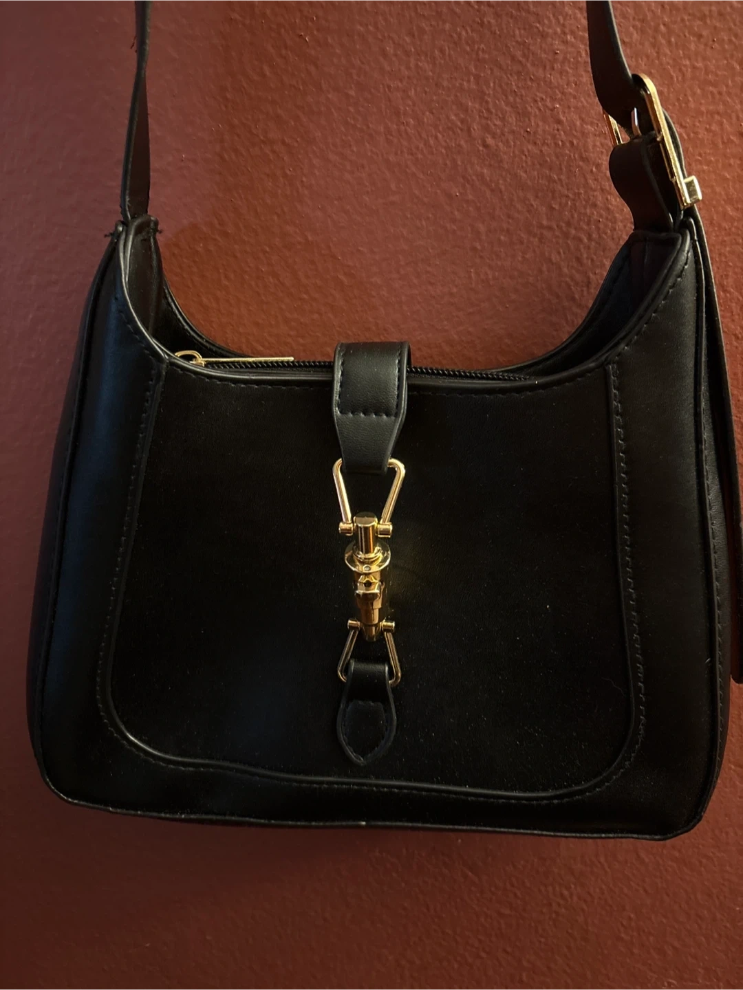 This is a stylish black vegan shoulder bag with eye-catching gold hardware. It's perfect for everyday use or a night out. The bag is NEW ready for a new owner!