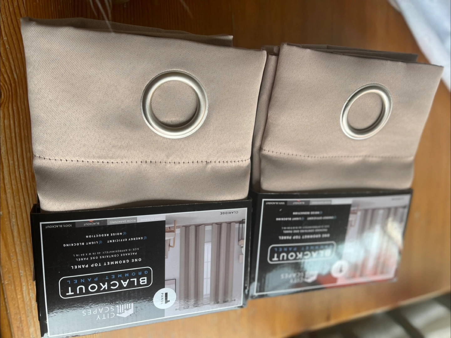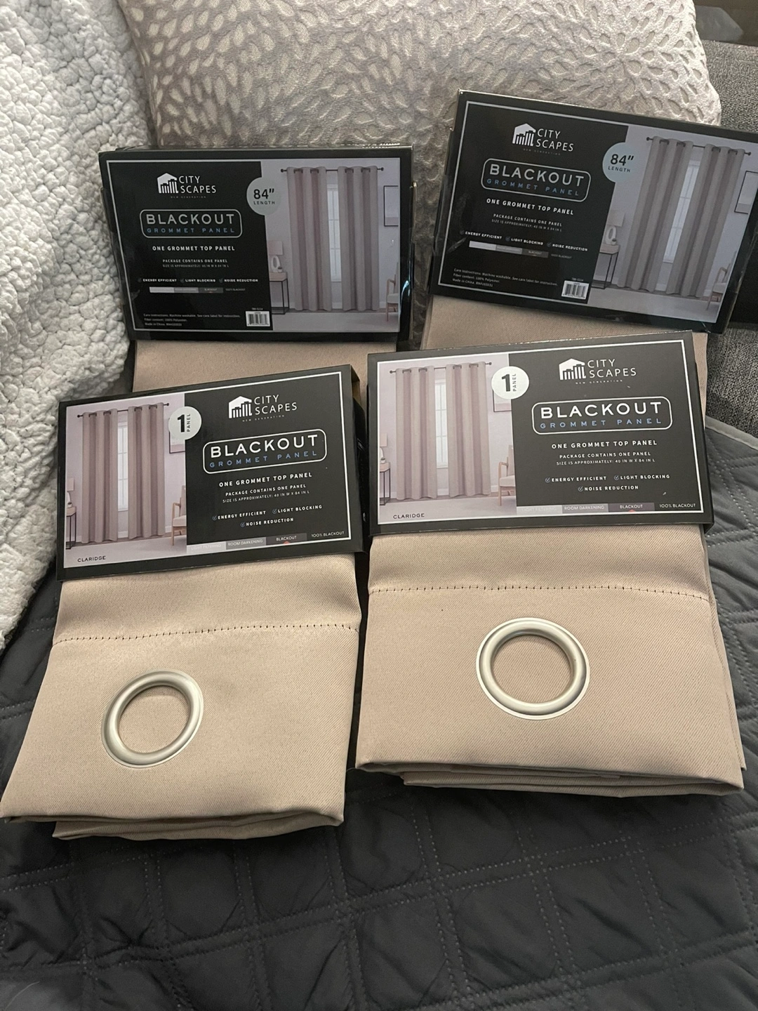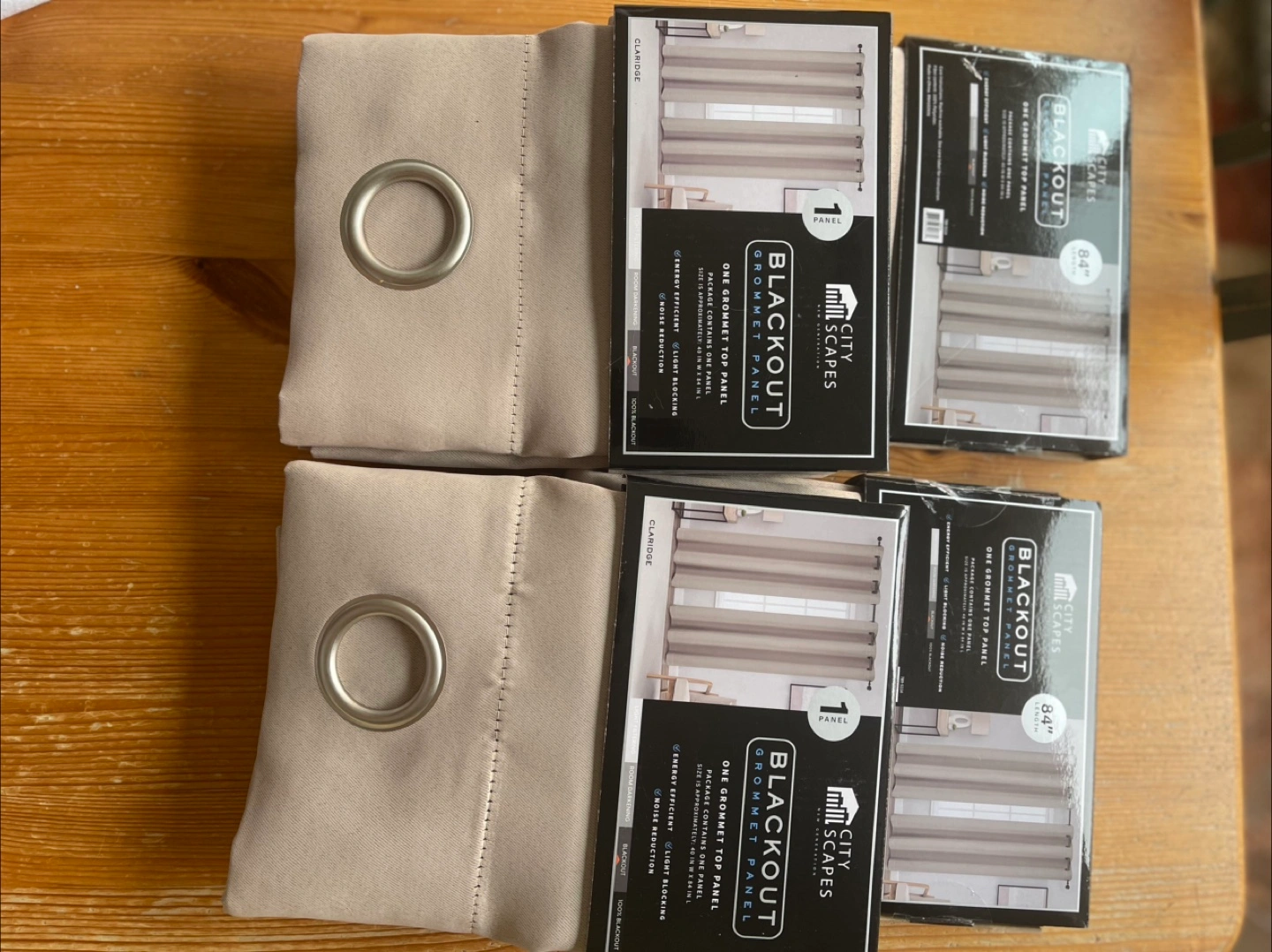 10The NEW Blackout Curtains in TAN by City Scapes are modern, solid panels made to measure 84" in length and 40" in width. These curtains are lined and made of polyester material, specifically designed to block out outside light and noise. Check package photo for level of room darkening. With a stylish modern look and a color of claridge, these curtains provide privacy and darkness for a comfortable home environment. 4 packages available (4 total panels) 12.99 each panel Perfect condition Unopened Smoke free home 📦 Shipping & Local Pickup Options: • Ships within 1 business day via USPS ground • Buyer pays shipping (calculated at checkout based on location) • Local pickup available in [Lagrange, IL area] – message me before purchase if preferred