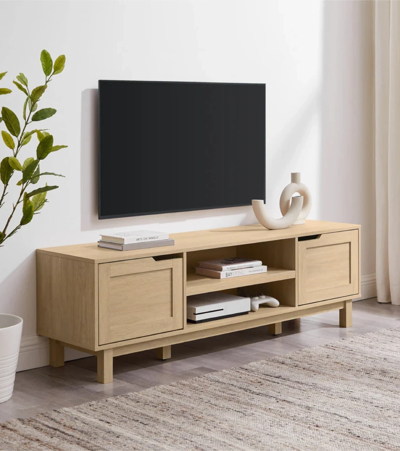172New Boho 2-Door TV Stand for TVs up to 65” * Excellent Reviews! * New In The Box - Excellent Condition * Dimensions: 58” L x 14.5” W x 17.75” H * Cord management port * 2 cabinets with hinged doors * Center display space * Supports TVs up to 65” * Verified and Trusted Seller - Read My Reviews * EC10