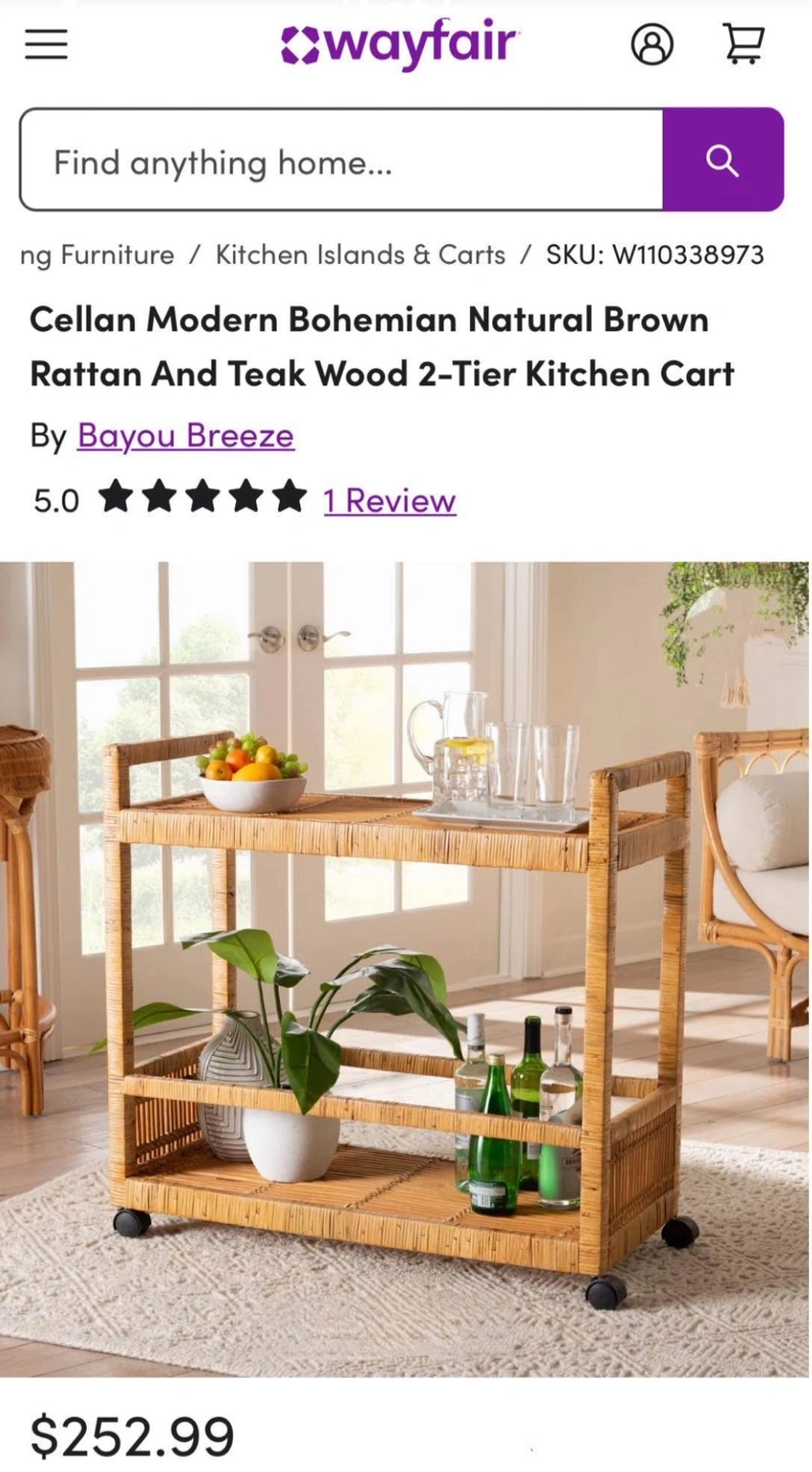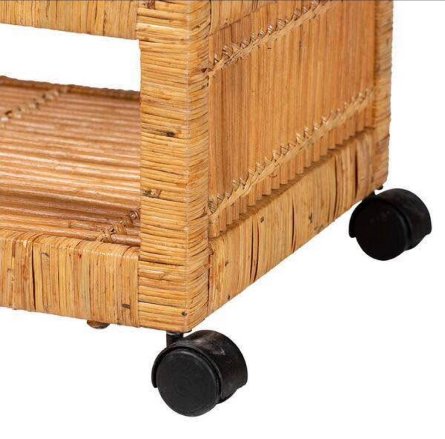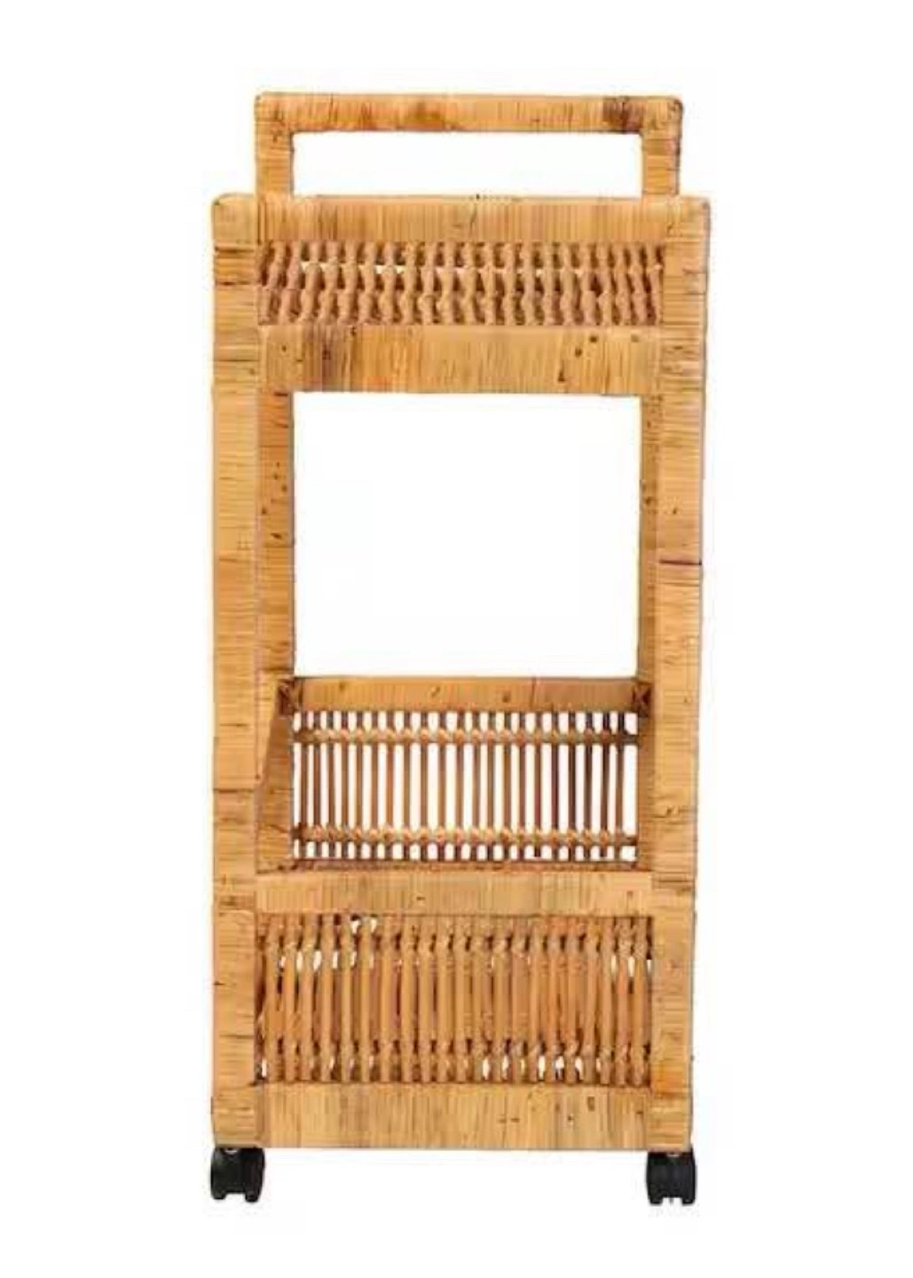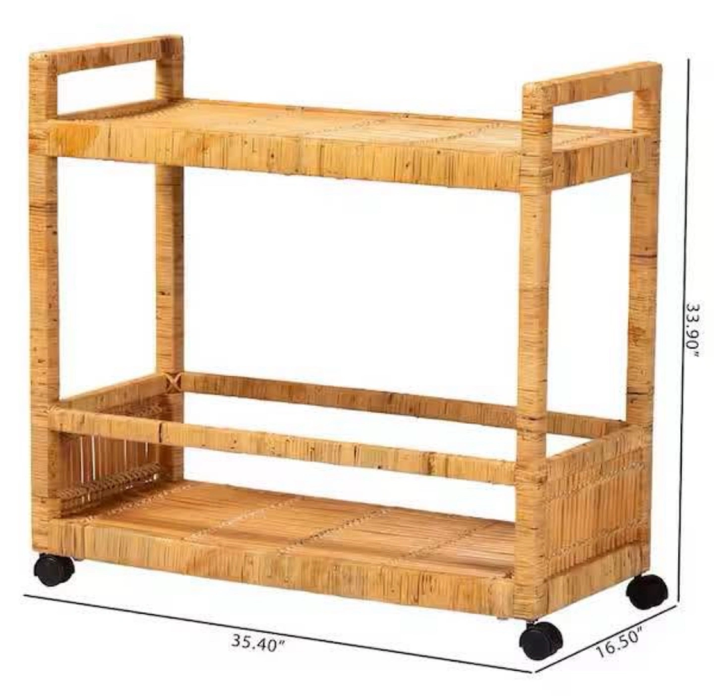 New Boho Bohemian Rattan Kitchen Cart Storage Table * New in the Box/Excellent Collection * Dimensions: 35.40" W x 16.50" D x 33.90" H * Upper Shelf: 35.40" W x 15.70" L * Distance between lower shelf and bottom of top shelf: 25.00" * Distance between lower shelf and horizontal support bars: 7.50" * Clearance/Wheels Height: 2.40" H * Modern bohemian kitchen cart * Constructed from Teak Wood and Natural Rattan * Two (2) shelves * Slatted rattan shelves * Ergonomic handles * Caster wheels * Fully assembled * Trusted Seller / Read/ See My Reviews! Follow Me For Amazing Deals Listed Daily! * WC(contact info removed)0B