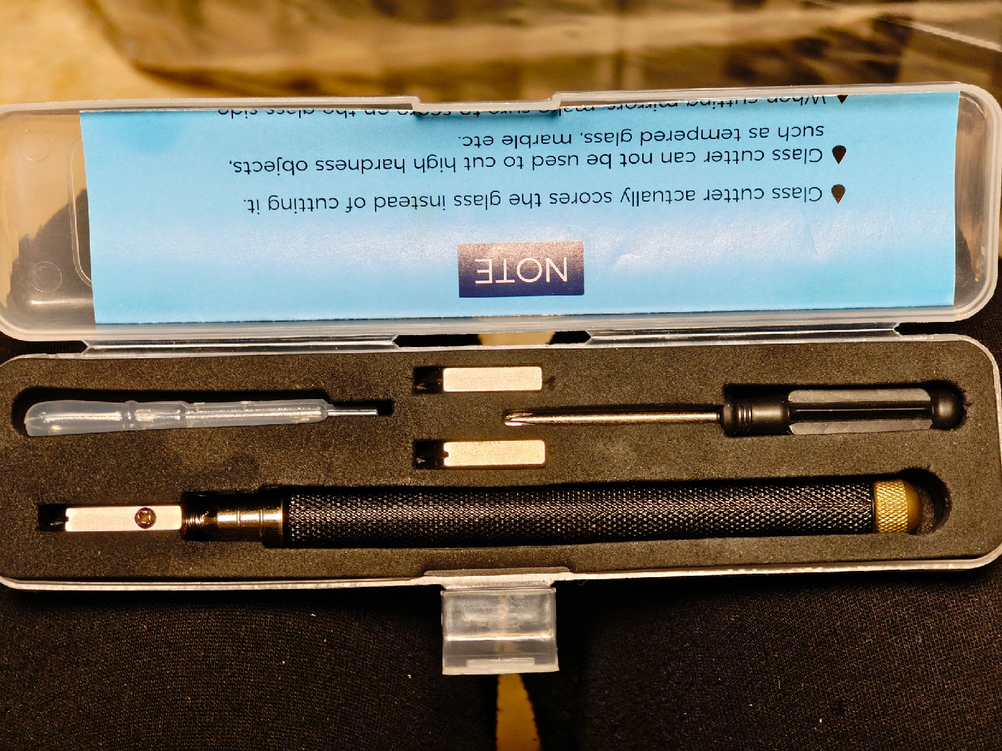 10I'm selling a new Camdios glass cutter tool kit. It's a pencil style oil feed carbide tip for glass cutting, tiles, mirrors, and mosaics. The glass cutter is 2mm-20mm and comes in its original box.