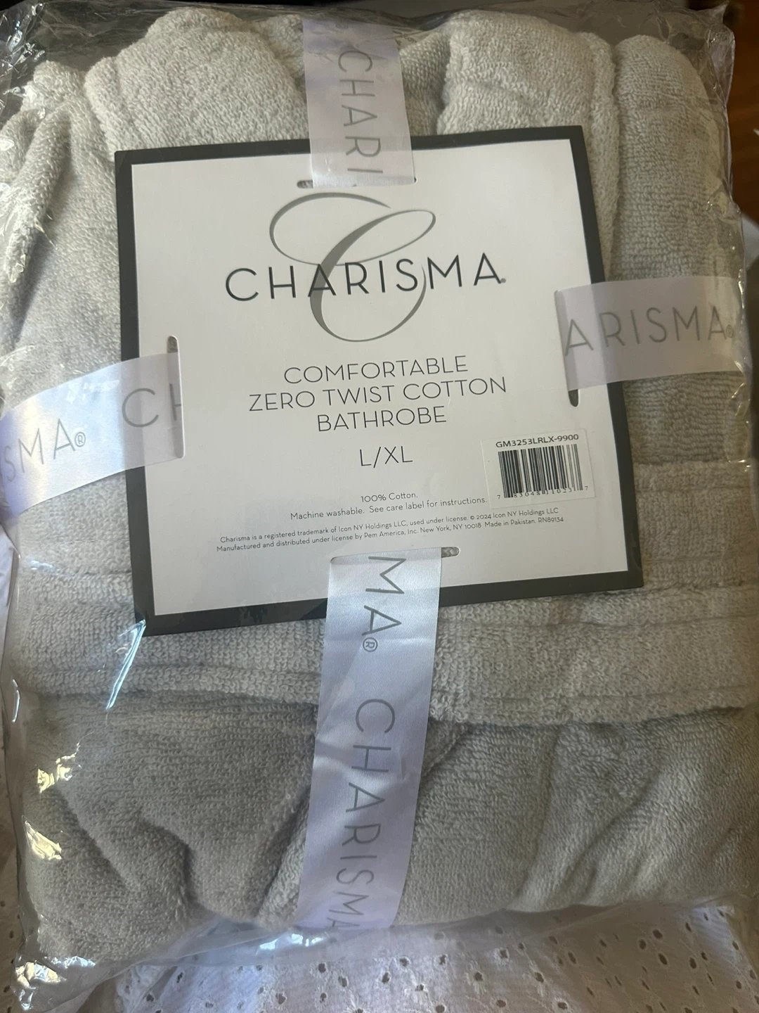 This is a brand new Charisma Comfortable Zero Twist Cotton Bathrobe in size L/XL! It's still in the original packaging. The material is 100% cotton. Originally bought on Amazon for $50.
