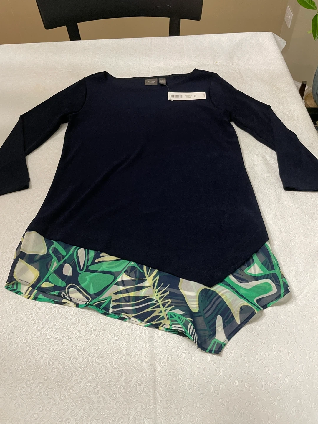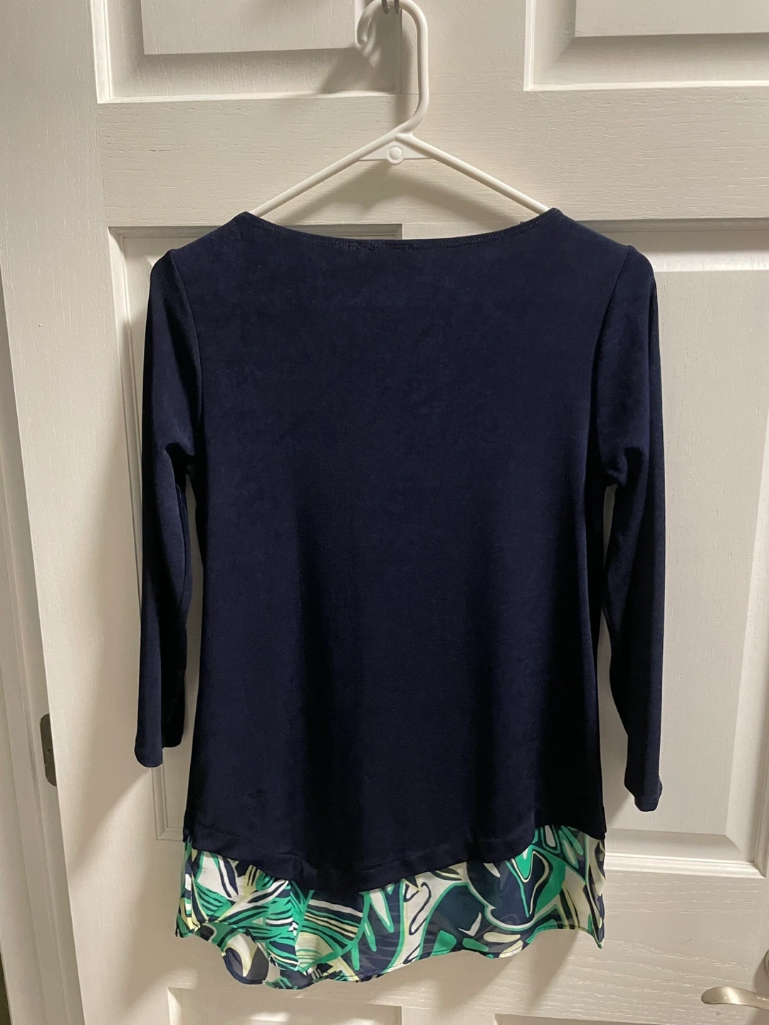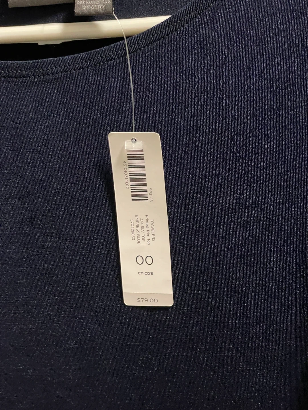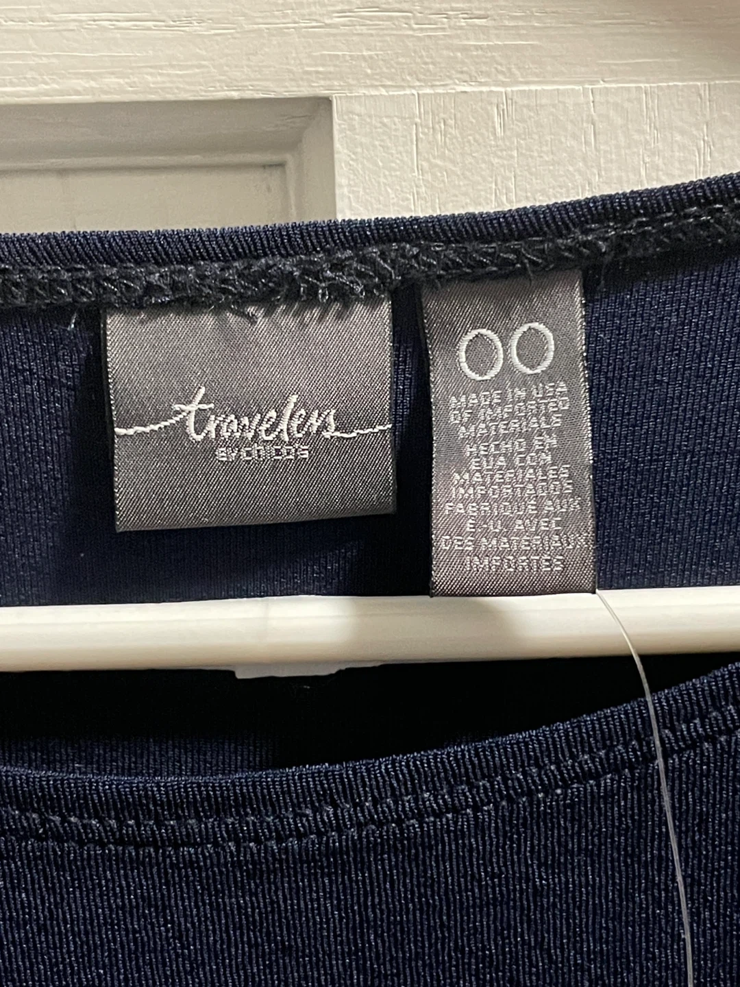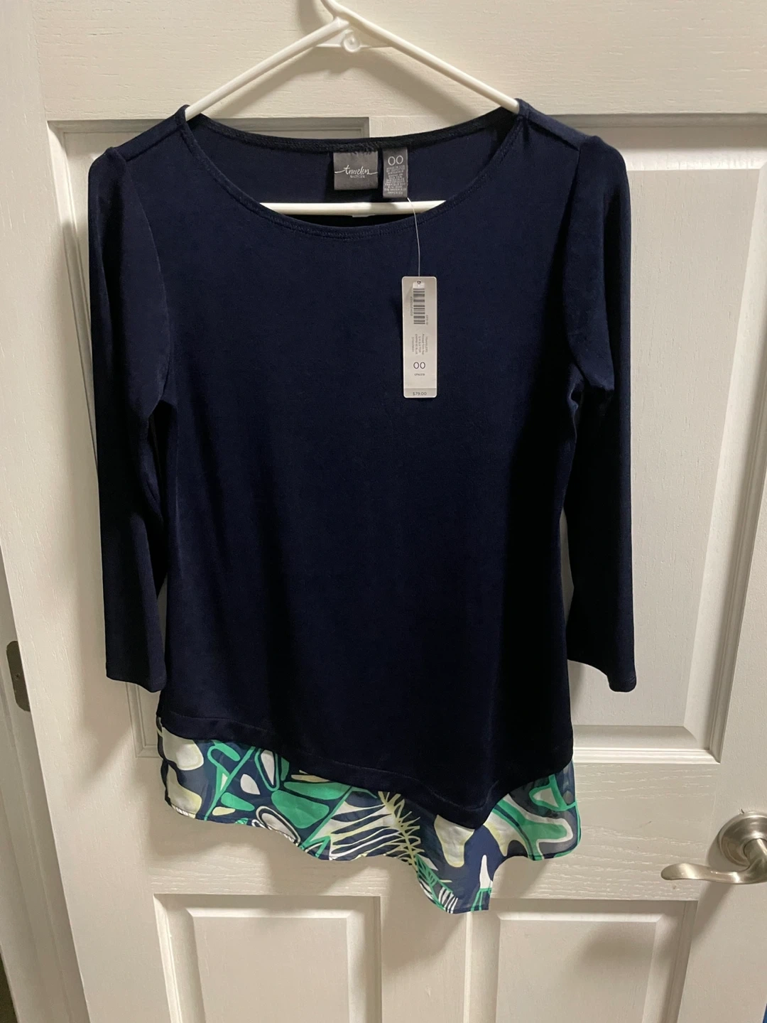 65This is a brand new Chico's Travelers top in size 00. It's in the Empress Blue color and has a stylish design. The tag shows it originally retailed for $79 Poly trim is 4@ long in navy/kelly/yellow/white