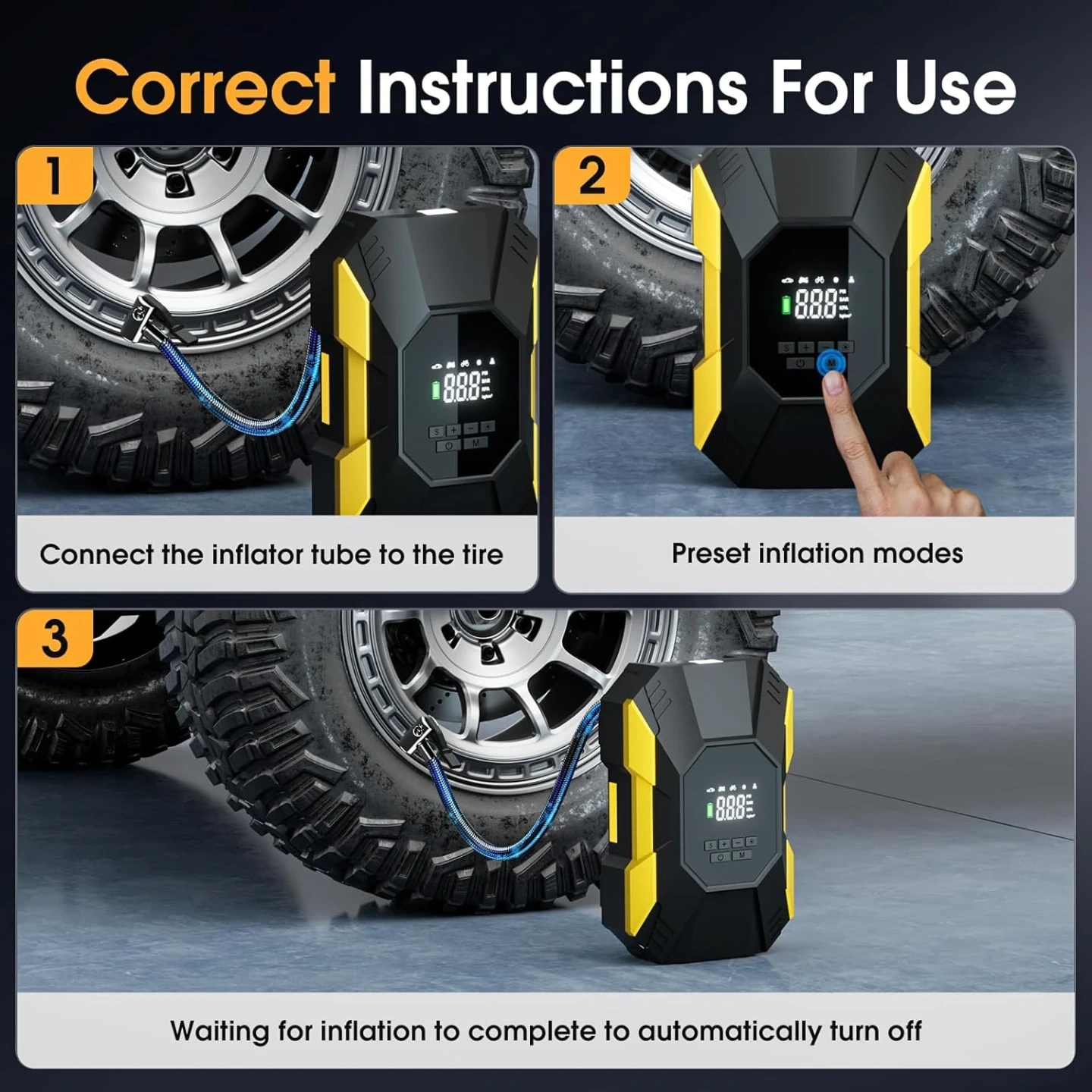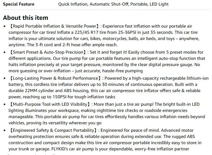 31Tire Inflator Portable Air Compressor-Electric Cordless Air Pump for Car Tires with Digital Pressure Gauge,150 PSI Portable Tire Inflator for Car, Motorcycle, Bicycle-LED Light and Auto Shut-Off Rapid Portable Inflation & Versatile Power: Experience fast inflation with our portable air compressor for car tires! Inflate a 225/45 R17 tire from 25-36PSI in just 35 seconds. This car tire inflator is your ultimate solution for cars, bikes, motorcycles, balls, air beds, and toys – anywhere, anytime. The 3-ft cord and 2-ft hose offer ample reach. Smart Preset & Auto-Stop Precision: Set it and forget it! Easily choose from 5 preset modes for different applications. Our tire pump for car portable features an intelligent auto-stop function that halts inflation precisely at your target pressure, monitored by the clear digital pressure gauge. No more guessing or over-inflation – just accurate, hassle-free pumping Elmhurst queens pick up Check out my other listings too