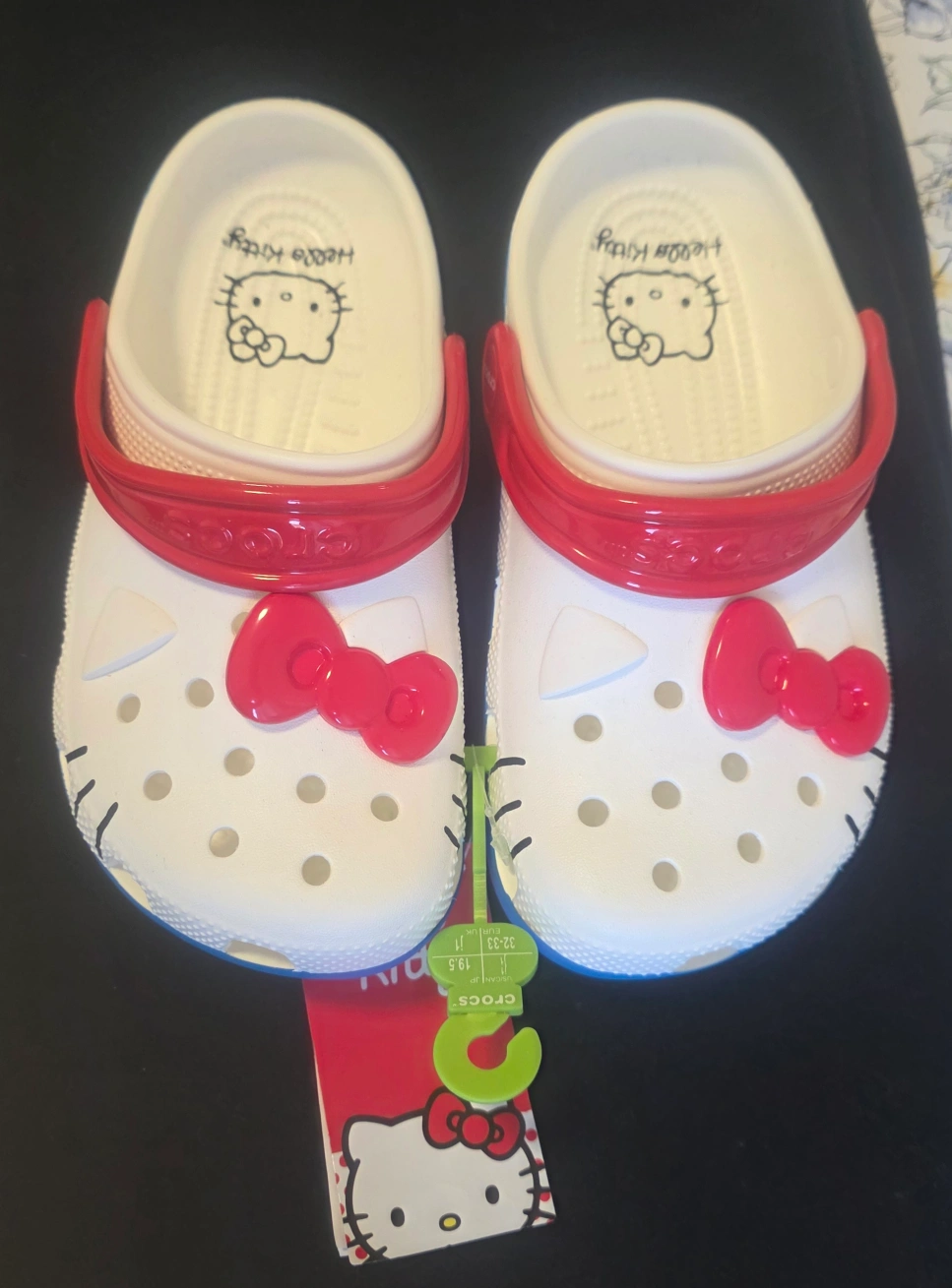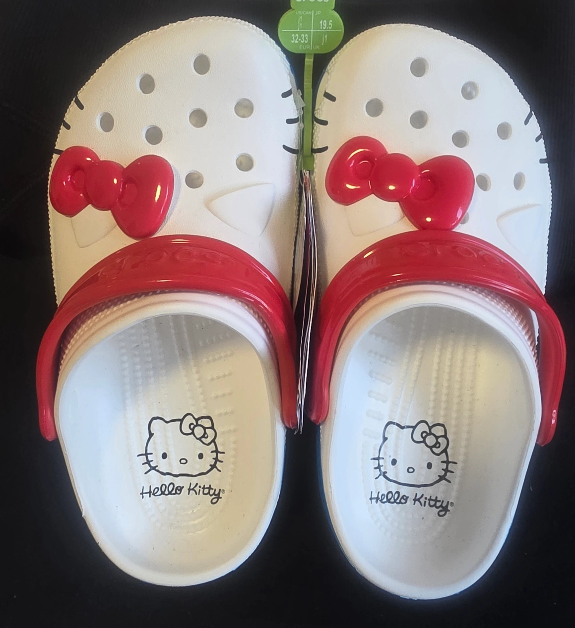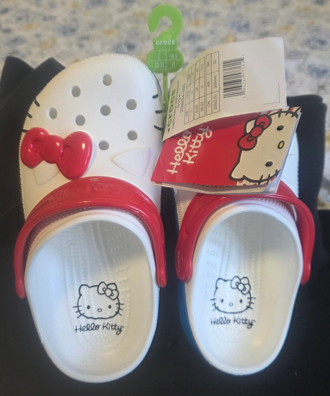 These are a pair of brand new Crocs Hello Kitty clogs! They are white with a red accent and a Hello Kitty design. They are size 1 J. in US sizing.
