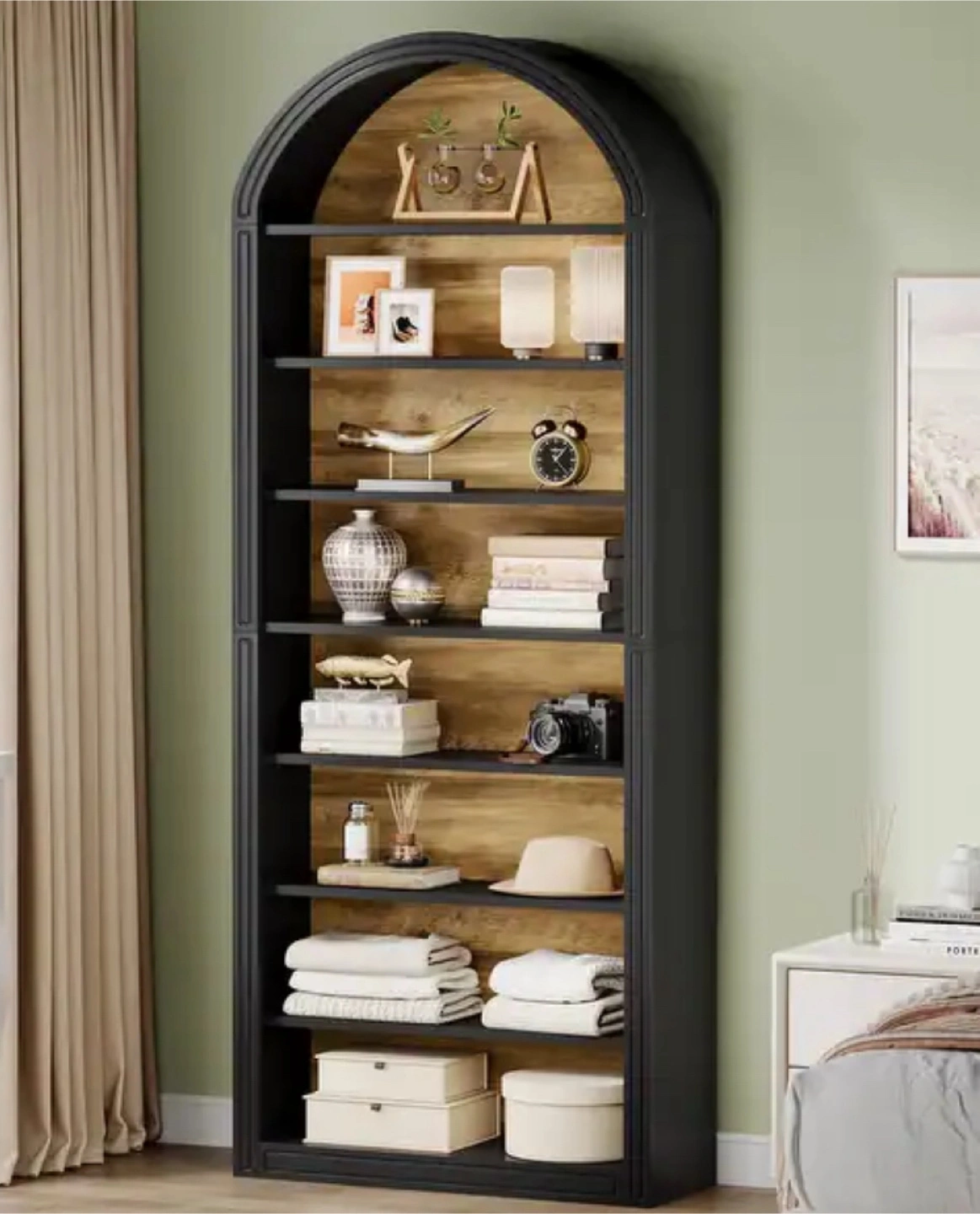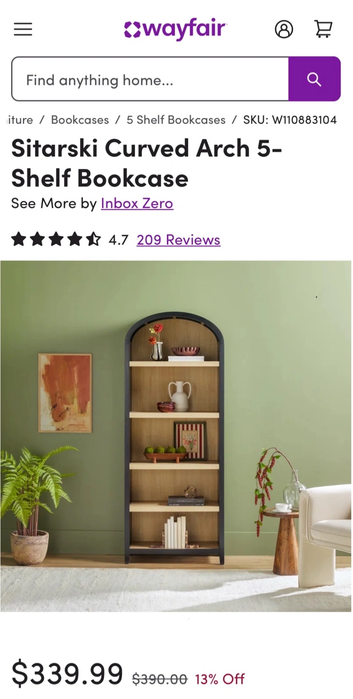 183Selling a Curved Arch 5-Shelf Bookcase. It's a stylish way to display your books and decor. Originally $339.99 New Elegant Black Sitarski Curved Arch 5 Shelf Bookcase Display Case EXCELLENT REVIEWS!! Dimensions: 76” H x 30” L x 15” W TRUSTED SELLER - Read / See My Reviews