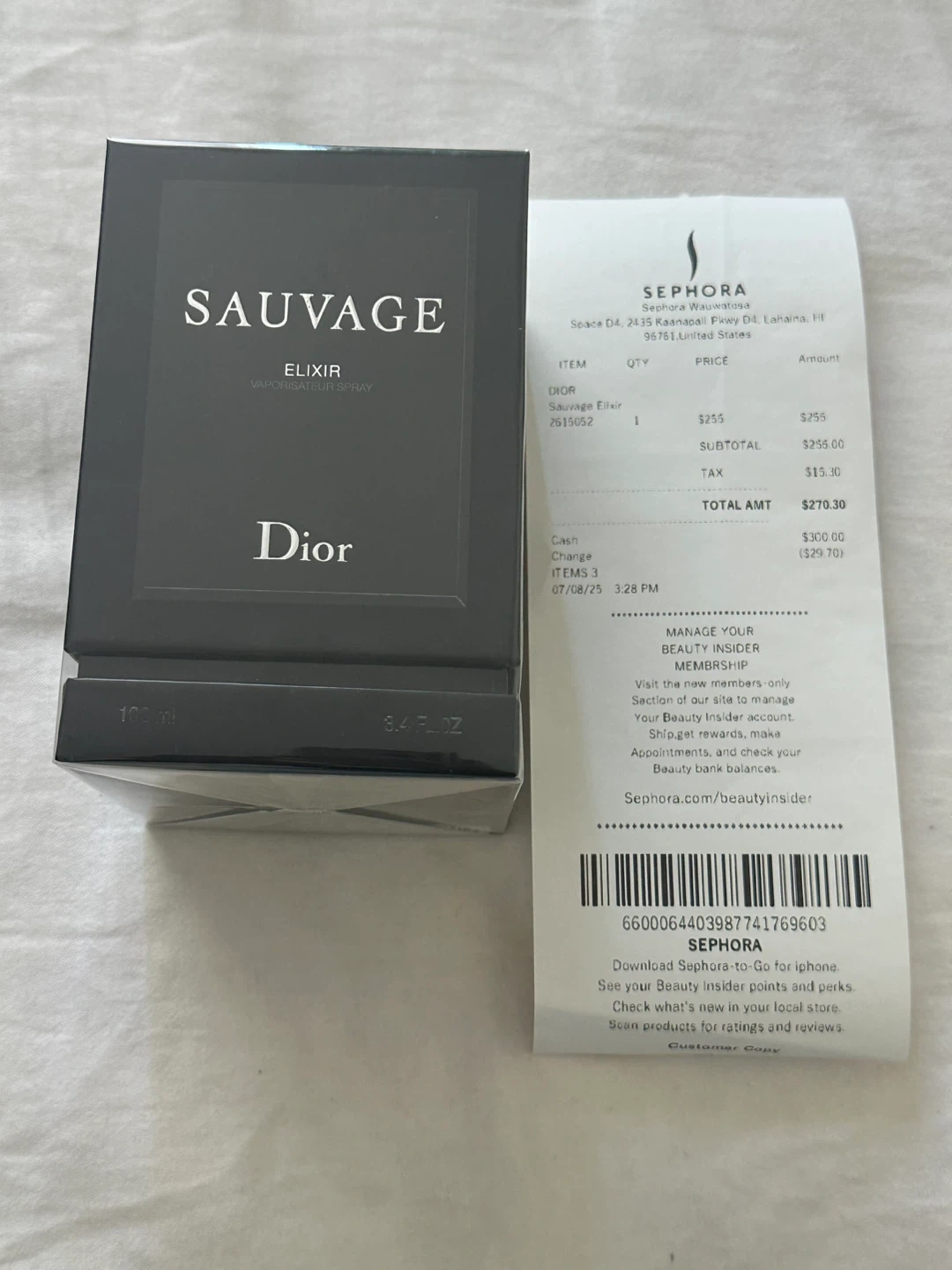 Brand new with receipt. Selling a brand new Dior Sauvage Elixir, 100ml size! It comes with the original box. I bought this for $255 + tax at Sephora.