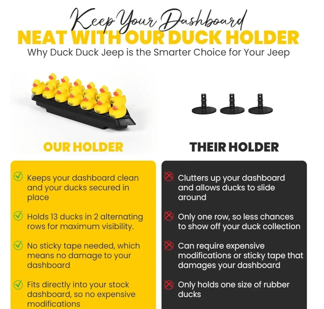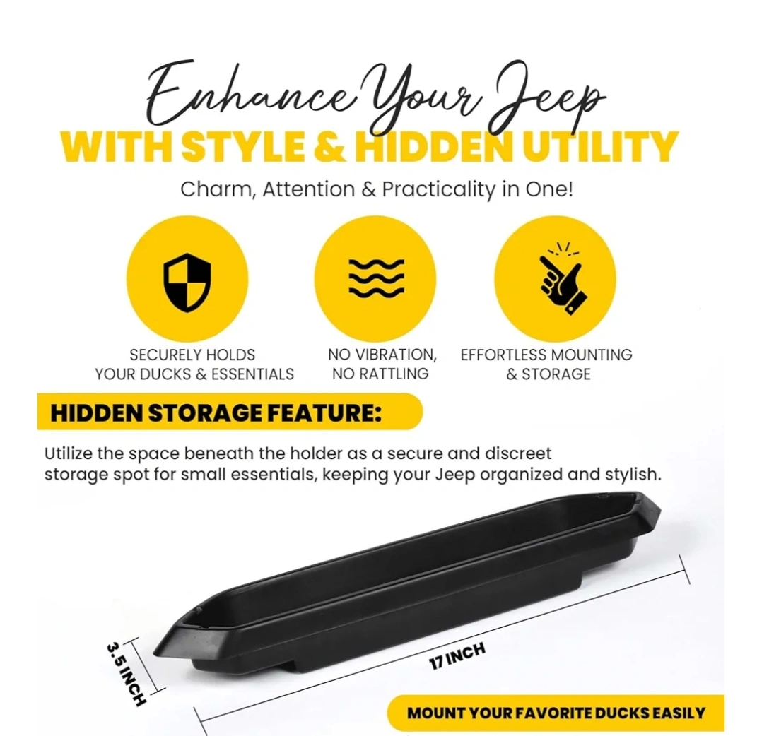 BRAND NEW Enhance Your Jeep JL with style and hidden utility! This duck holder securely holds your ducks and essentials with no vibration and effortless mounting and storage. It also has a hidden storage feature to utilize the space beneath the holder as a secure and discreet storage spot for small essentials, keeping your Jeep organized and stylish. Dimensions are 3.5 inch x 17 inch