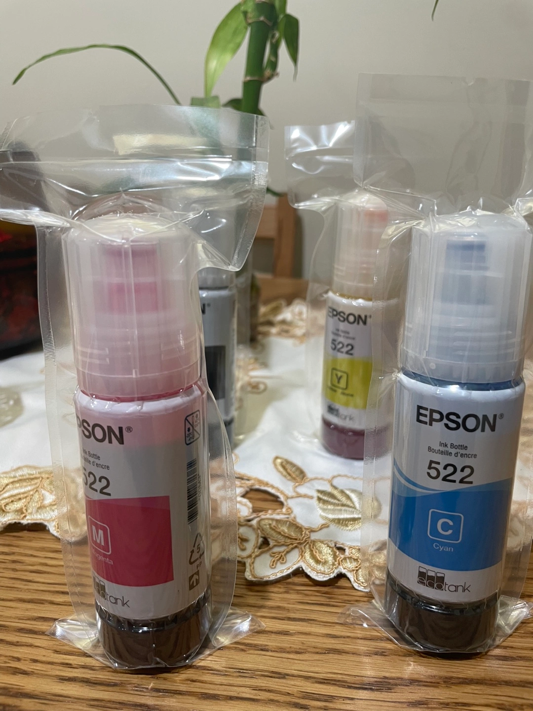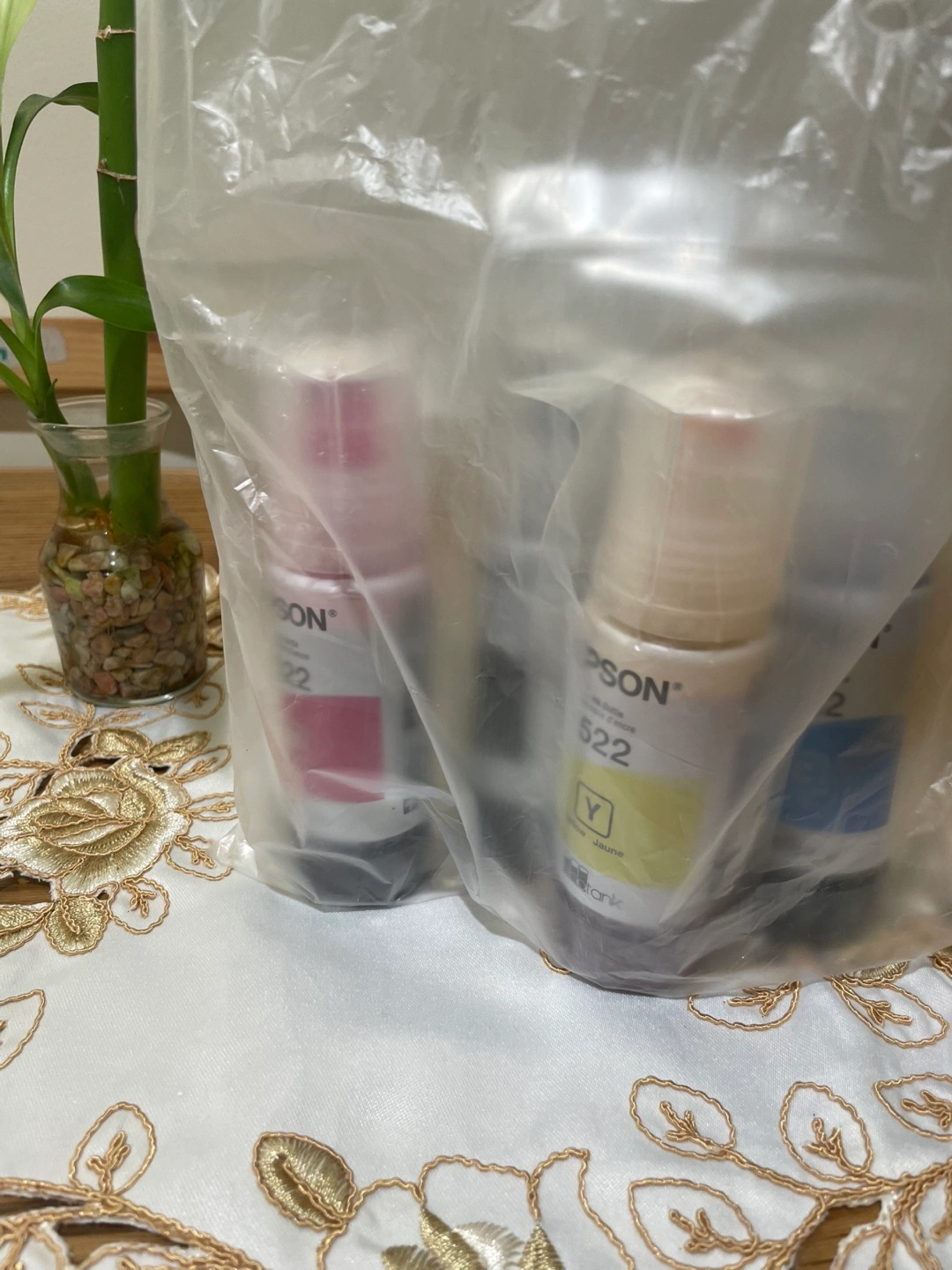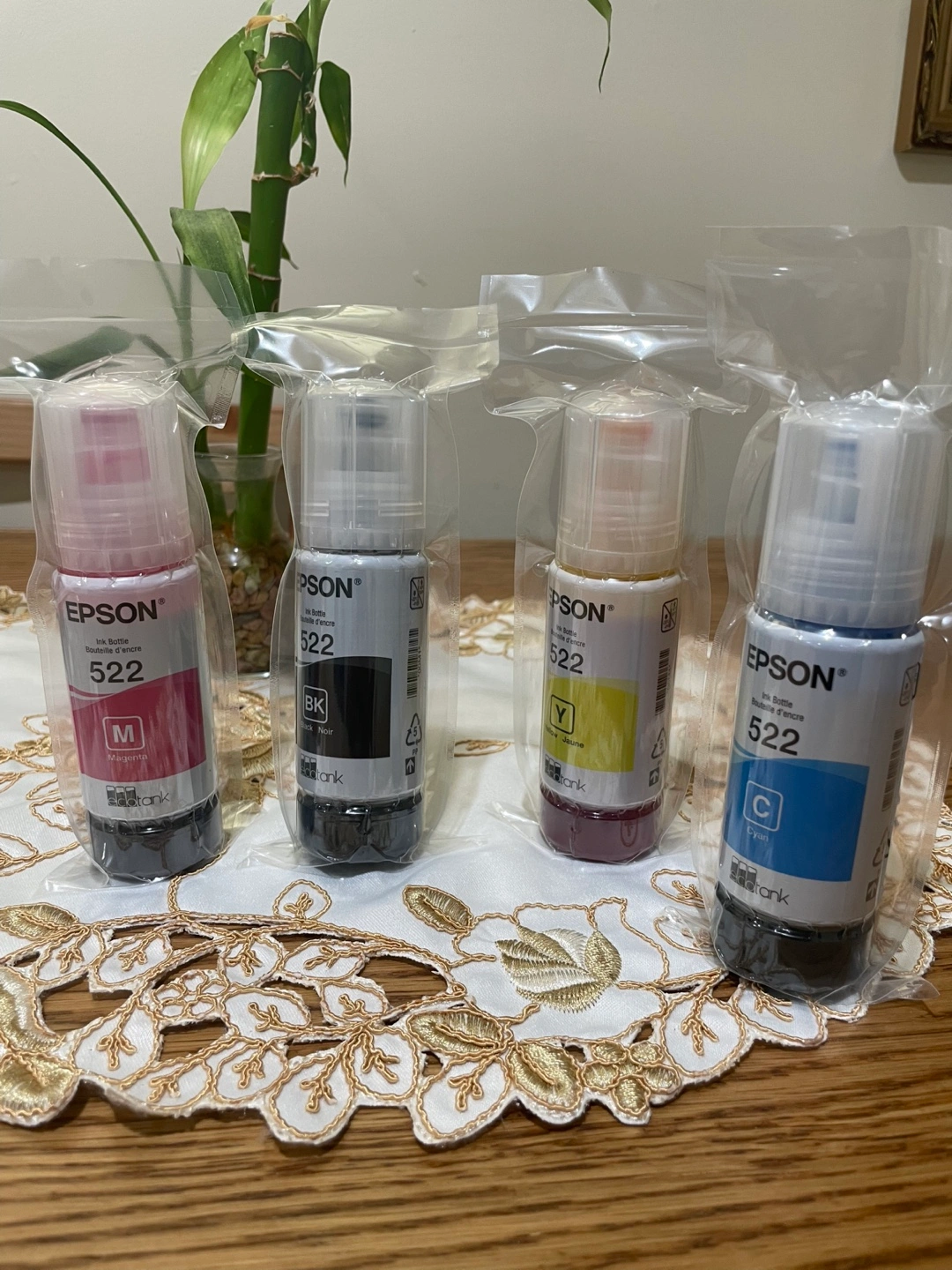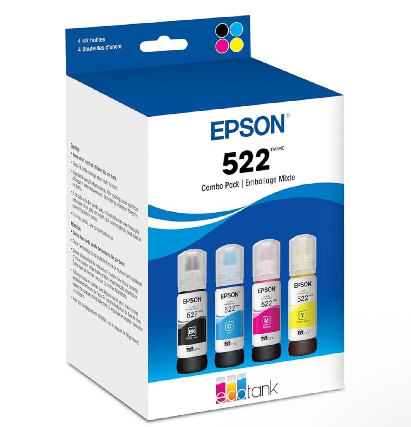 I'm selling a brand new Epson 522 ink bottle combo pack! This includes four ink bottles: black, cyan, magenta, and yellow. Perfect for your EcoTank printer!