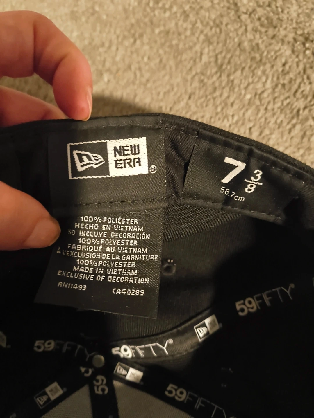 65Selling a New Era 59FIFTY hat in size 7 3/8. It's made of 100% polyester and has a sleek design. The hat is black with a red New Era logo on the side. A stylish and comfortable hat for any occasion!