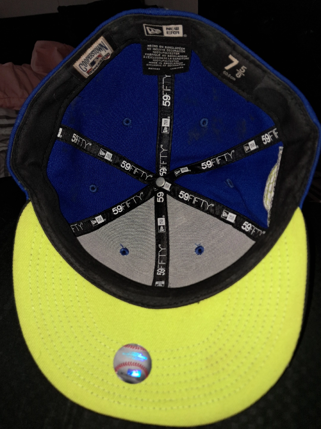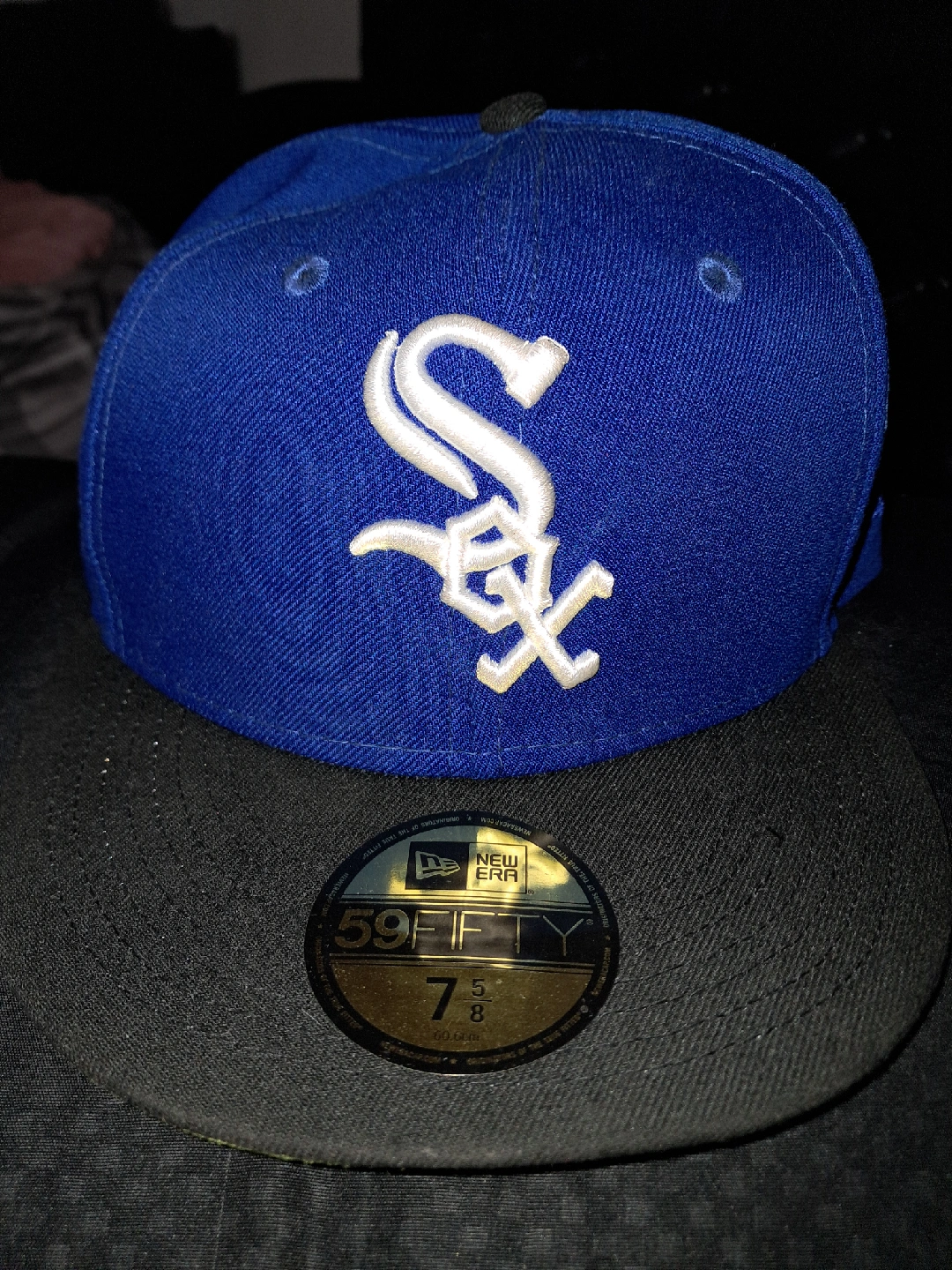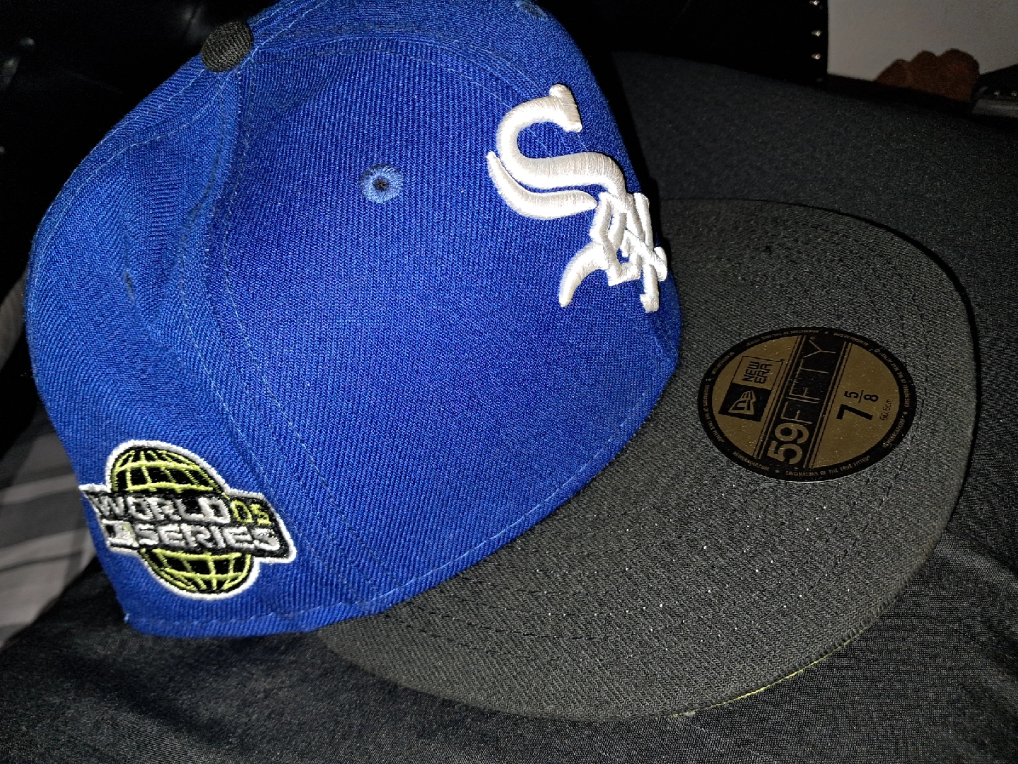 65Selling a New Era 59FIFTY Chicago White Sox fitted hat. It's a size 7 5/8. The hat is blue with a black brim and a World Series patch. The underbrim is yellow. It's in great condition!