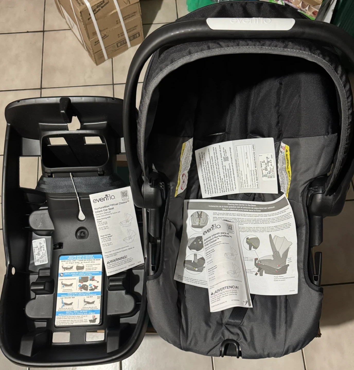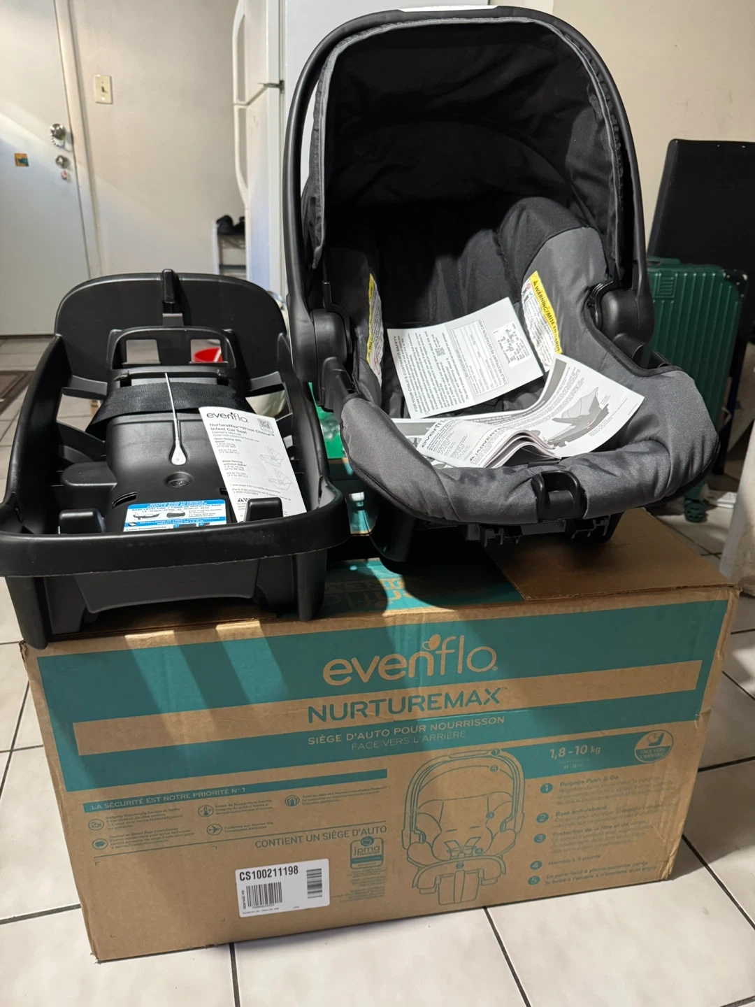 21Selling an Evenflo NurtureMax infant car seat with its base! It's in new condition and comes with the original box. This car seat is designed for newborns and infants weighing between 1.8-10 kg. It's a safe and reliable option for your little one