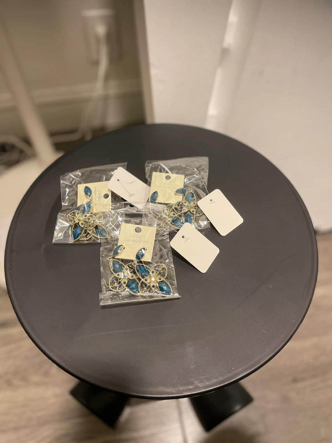 Selling new earrings from FASHION. They are still in their original packaging and have never been worn. These earrings feature a beautiful design with blue accents and a gold-tone finish. Perfect for adding a touch of elegance to any outfit!