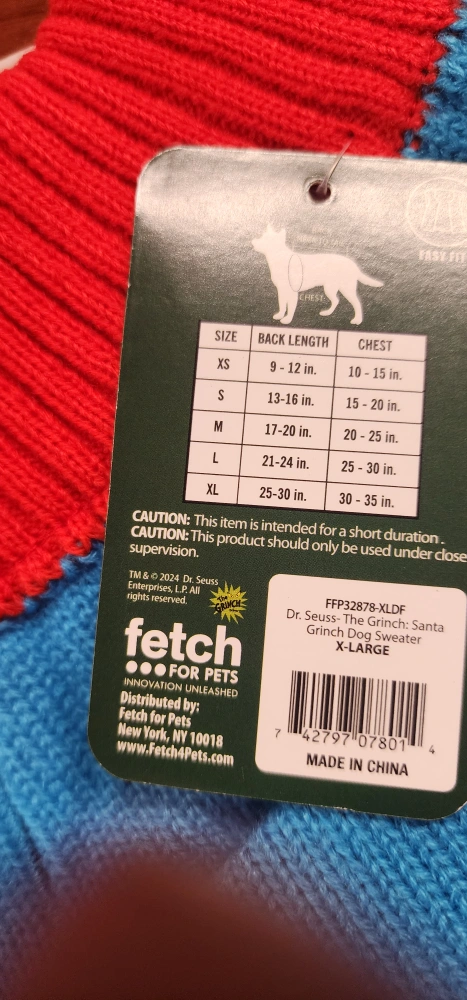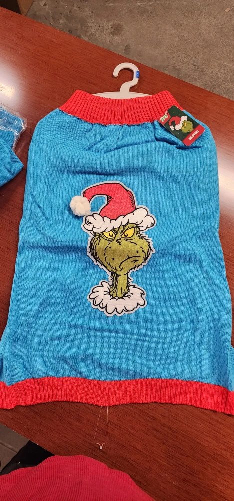 This is a brand new Fetch for Pets Dr. Seuss The Grinch Santa Grinch Dog Sweater in size X-Large! It's blue and red with a fun Grinch design. Perfect for keeping your furry friend warm and festive!