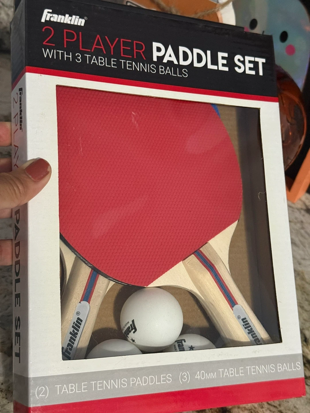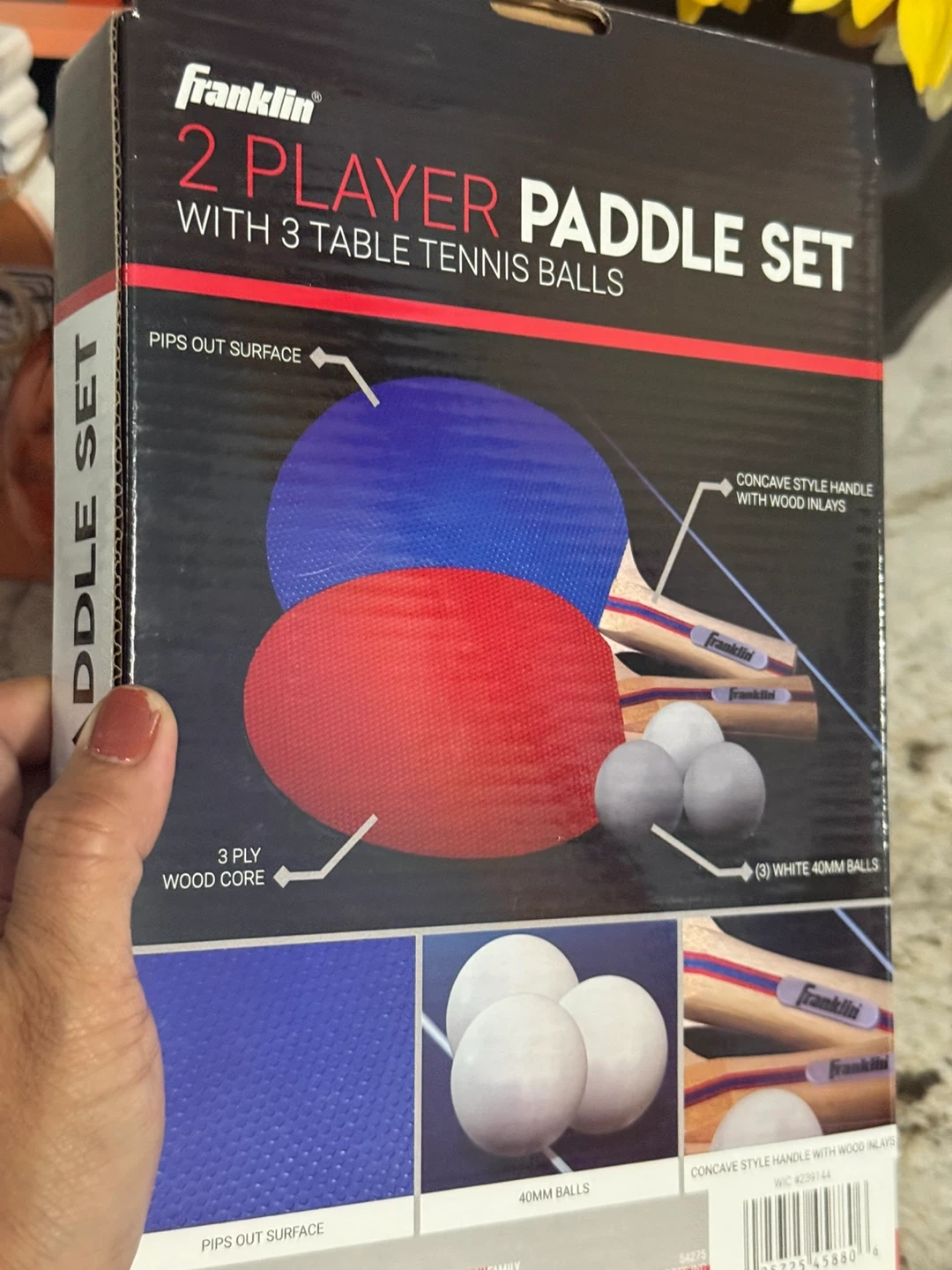 New Selling a Franklin 2 Player Paddle Set with 3 table tennis balls! It features a pips out surface and a 3 ply wood core. The handle has a concave style with wood inlays. The set includes (2) table tennis paddles and (3) 40mm table tennis balls